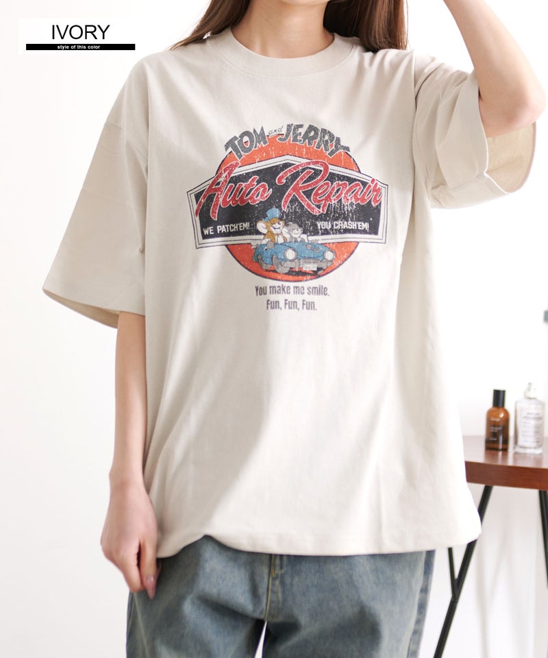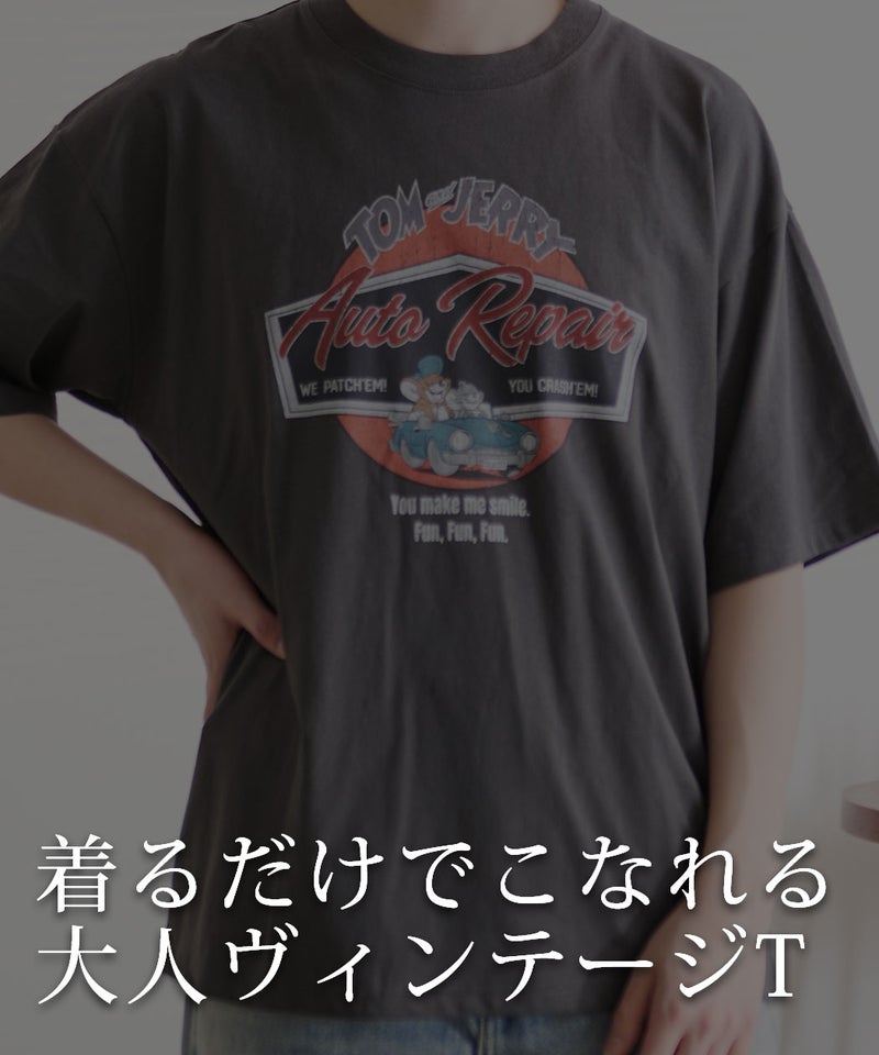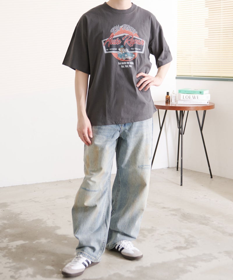 世界中で長く愛され続ける人気アニメ「トムとジェリー」のグラフィックを落とし込んだ、ユーズドライクな雰囲気が魅力のクルーネック半袖Tシャツ。