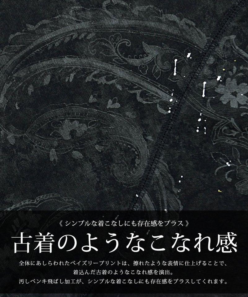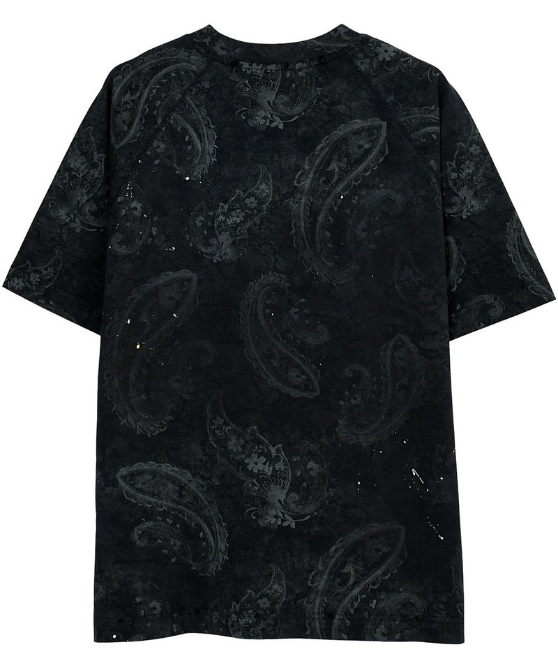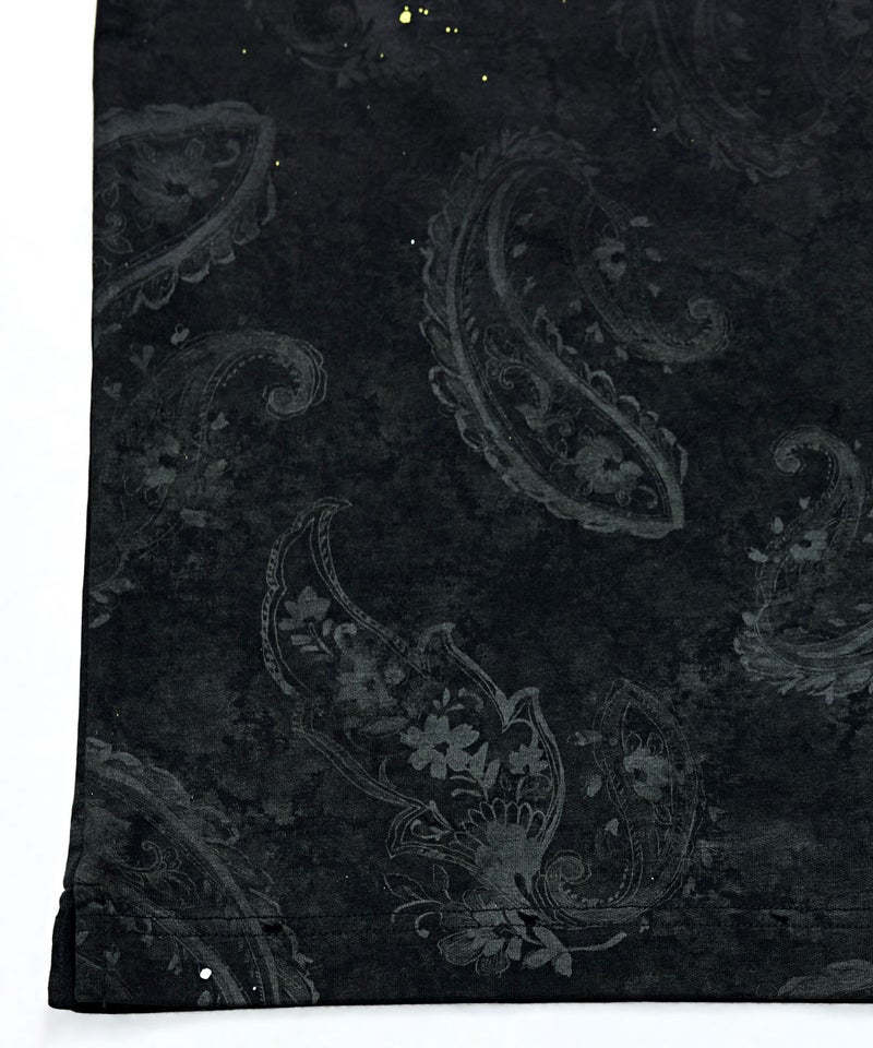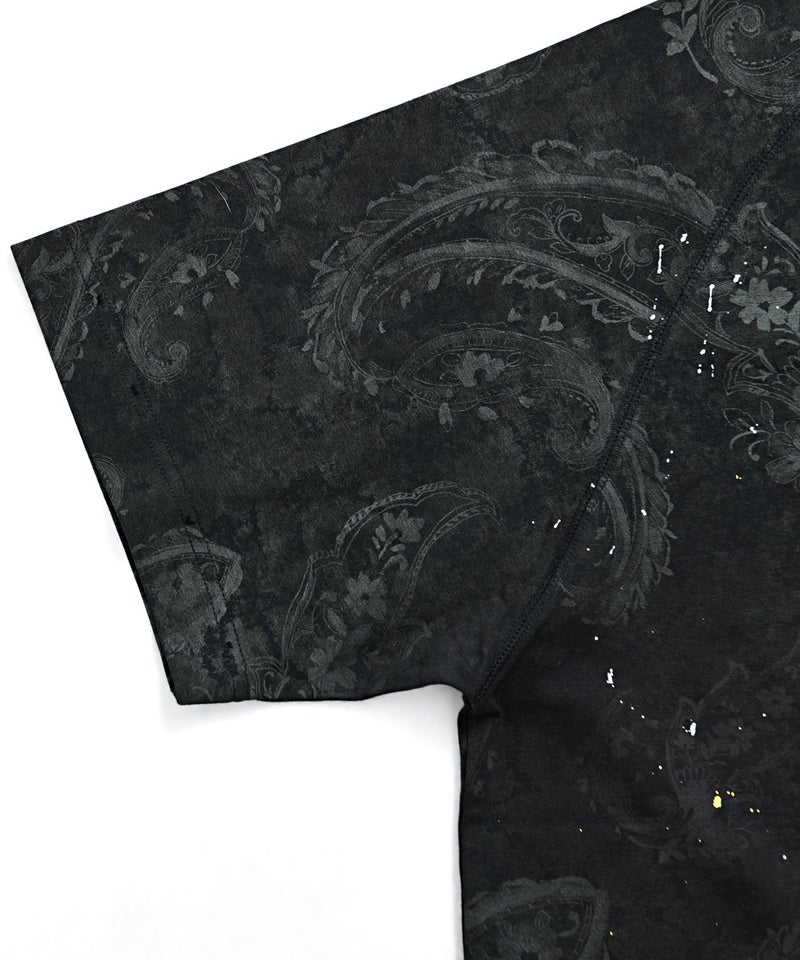 落ち着いたブラックベースにペイズリー柄を重ね、さらに擦れ感のあるプリントやペンキ飛ばし加工を施した、ヴィンテージライクな雰囲気漂う半袖Tシャツです。