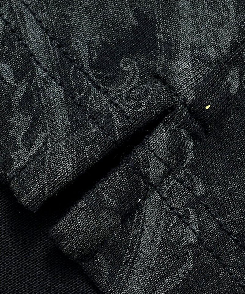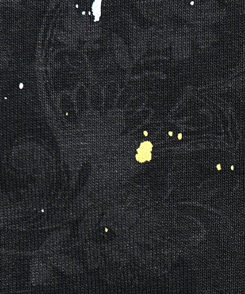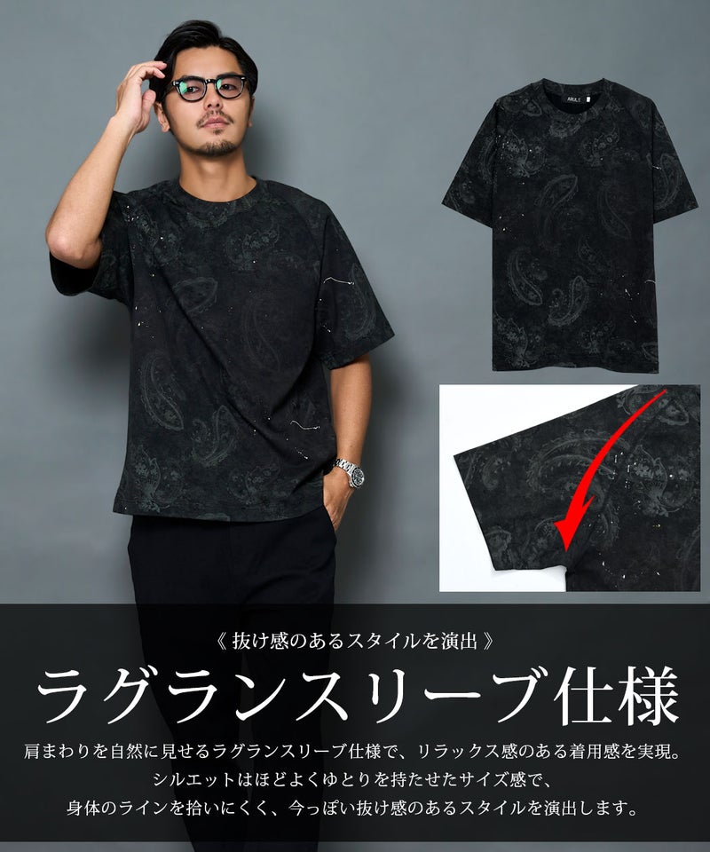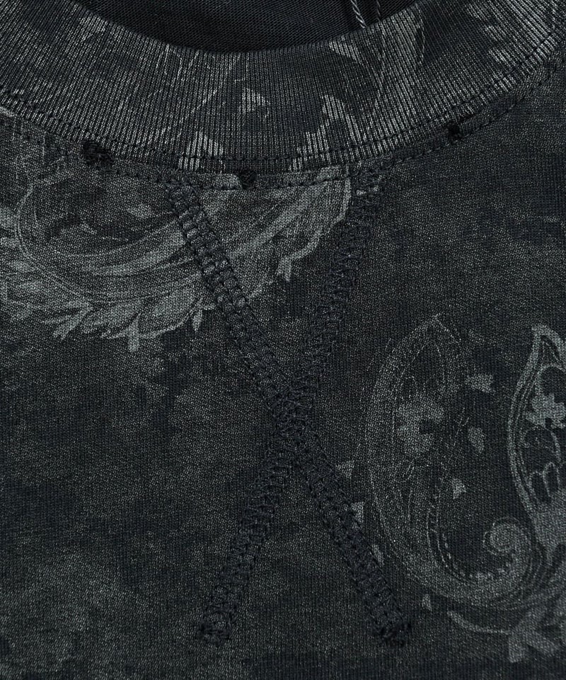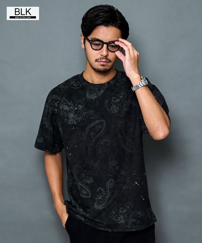 落ち着いたブラックベースにペイズリー柄を重ね、さらに擦れ感のあるプリントやペンキ飛ばし加工を施した、ヴィンテージライクな雰囲気漂う半袖Tシャツです。