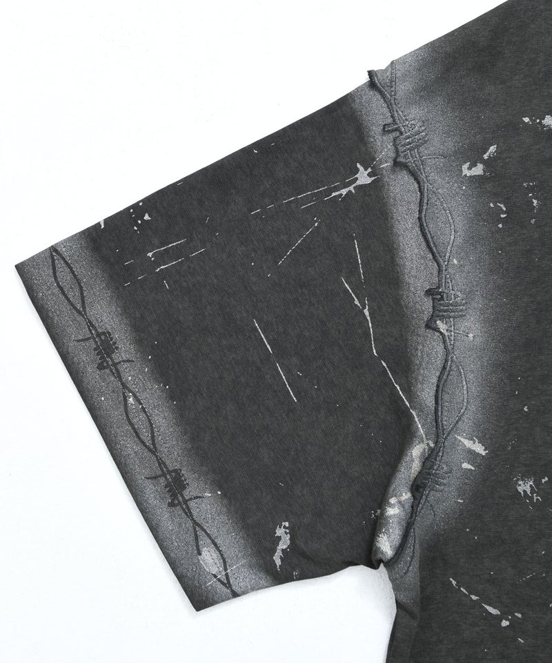 インパクトのある有刺鉄線モチーフとラメプリントを組み合わせた、存在感抜群の半袖Tシャツです。