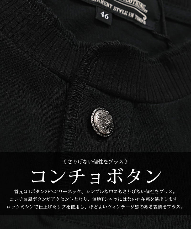 コンチョ風ボタンがアクセントとなり、無地Tシャツにはない存在感を演出します。