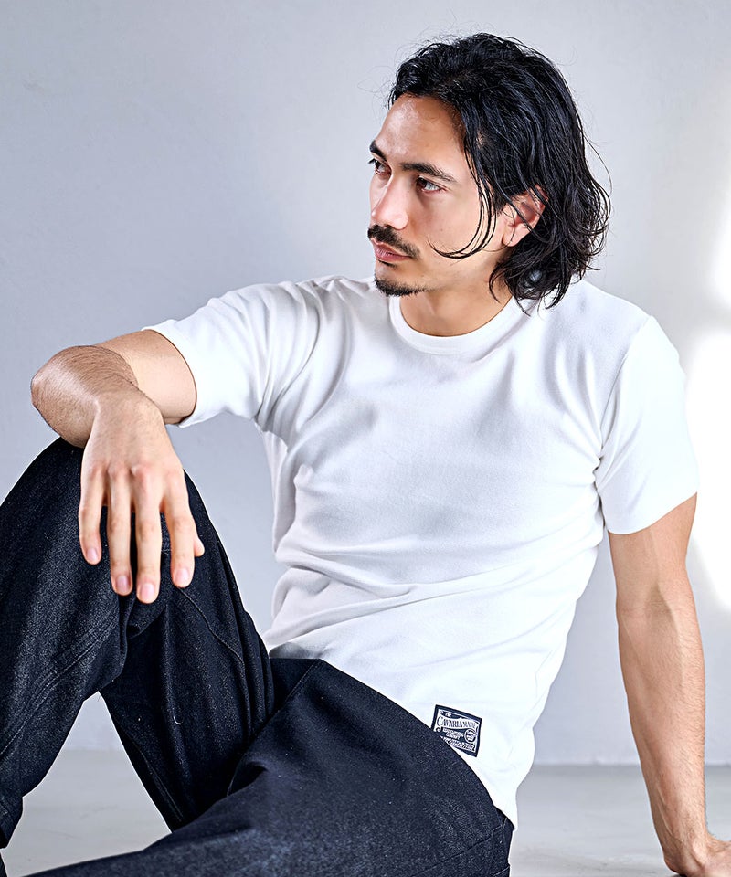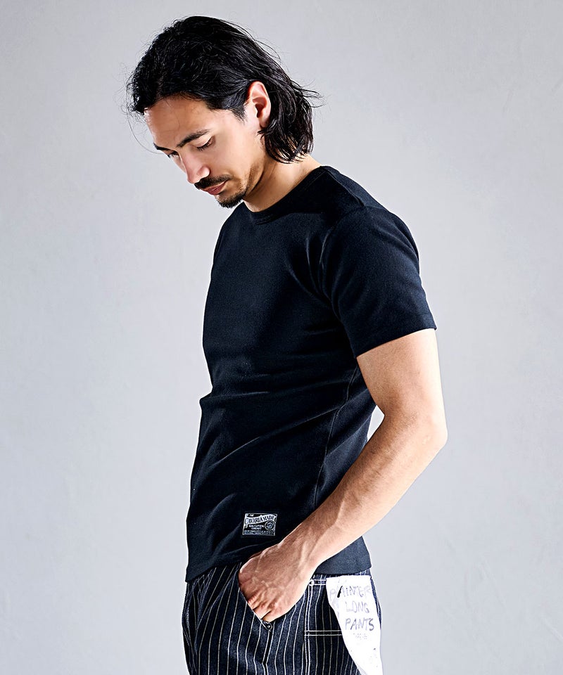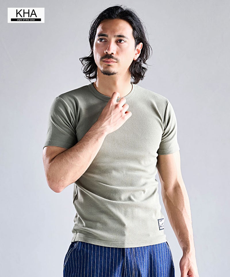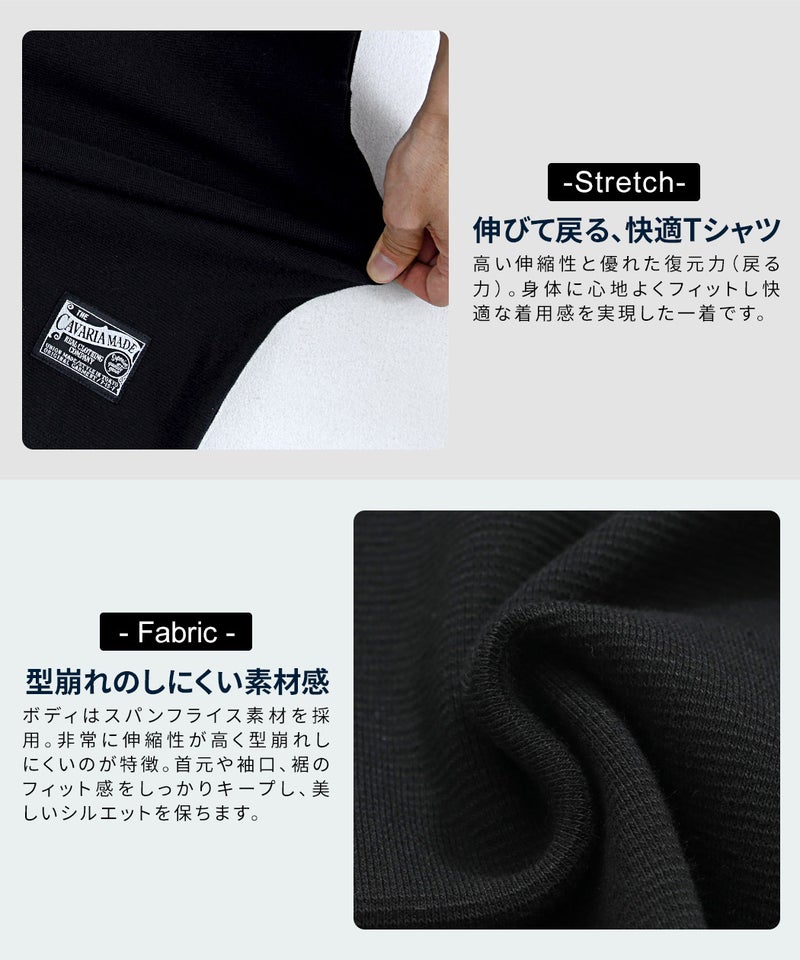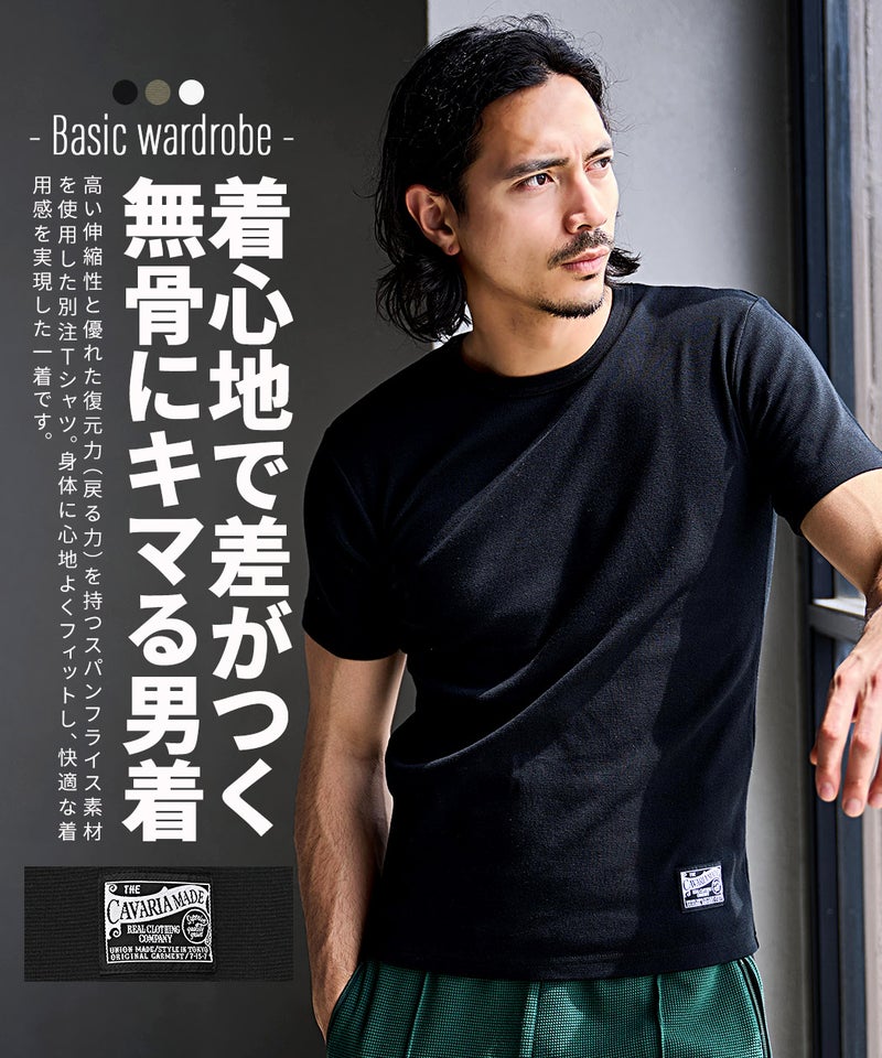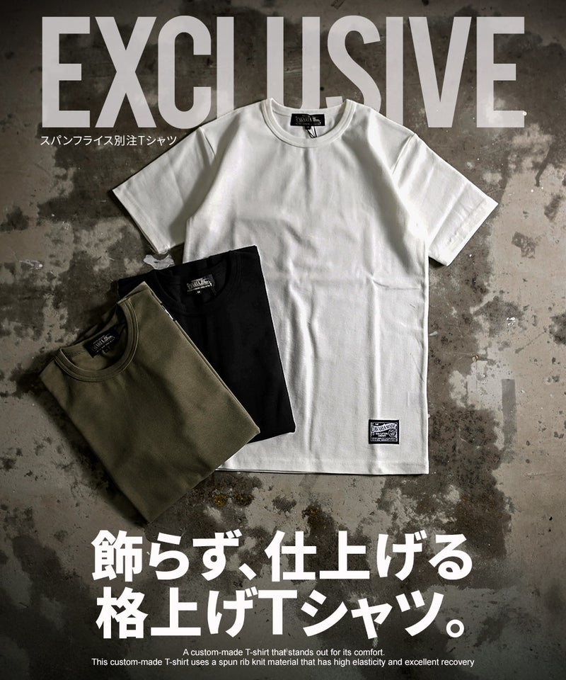 高い伸縮性と優れた復元力(戻る力)を持つスパンフライス素材を使用した別注Tシャツ。