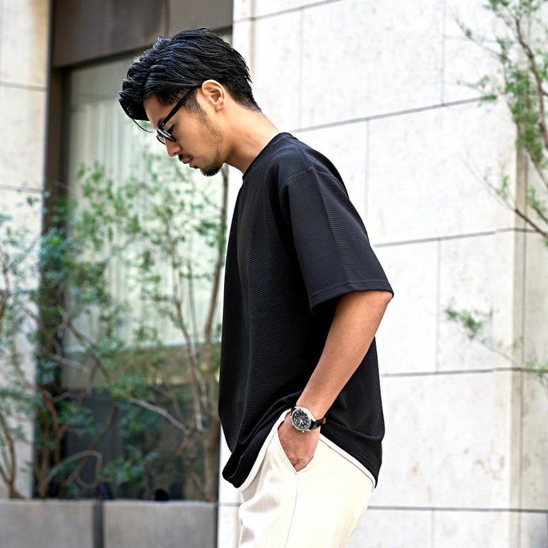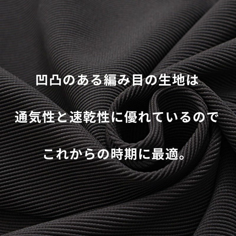 凹凸のある編み目の生地は通気性と速乾性に優れているのでこれからの時期に最適。