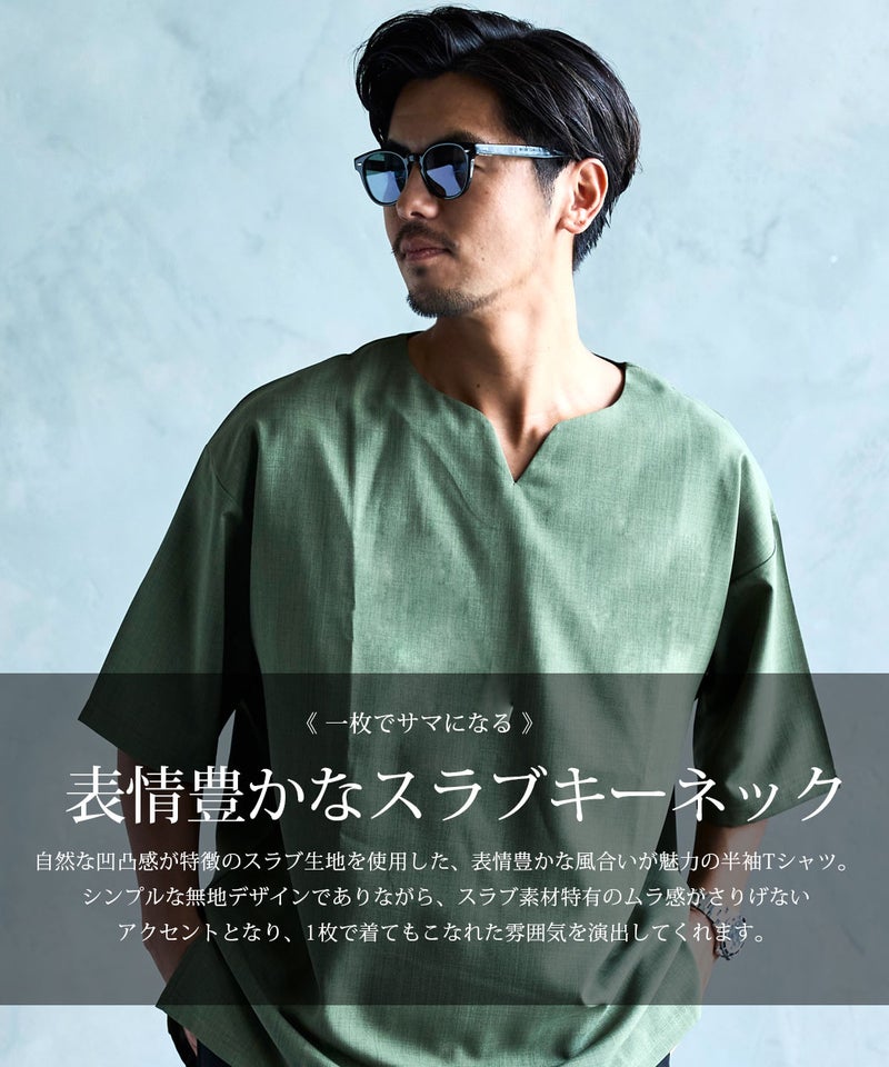 シンプルな無地デザインでありながら、スラブ素材特有のムラ感がさりげないアクセントとなり、1枚で着てもこなれた雰囲気を演出してくれます。