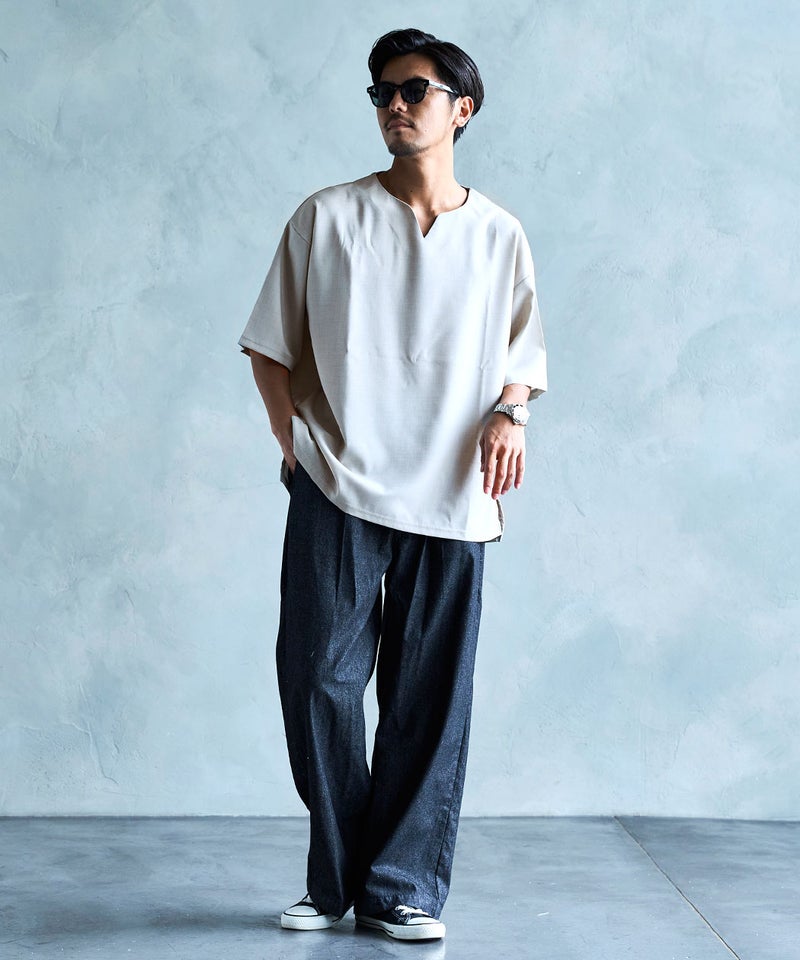 デニムやカーゴパンツ、ワイドパンツ、ショーツなど様々なボトムスと相性が良く、カジュアルからリラックススタイルまで幅広いコーディネートに取り入れることができます。