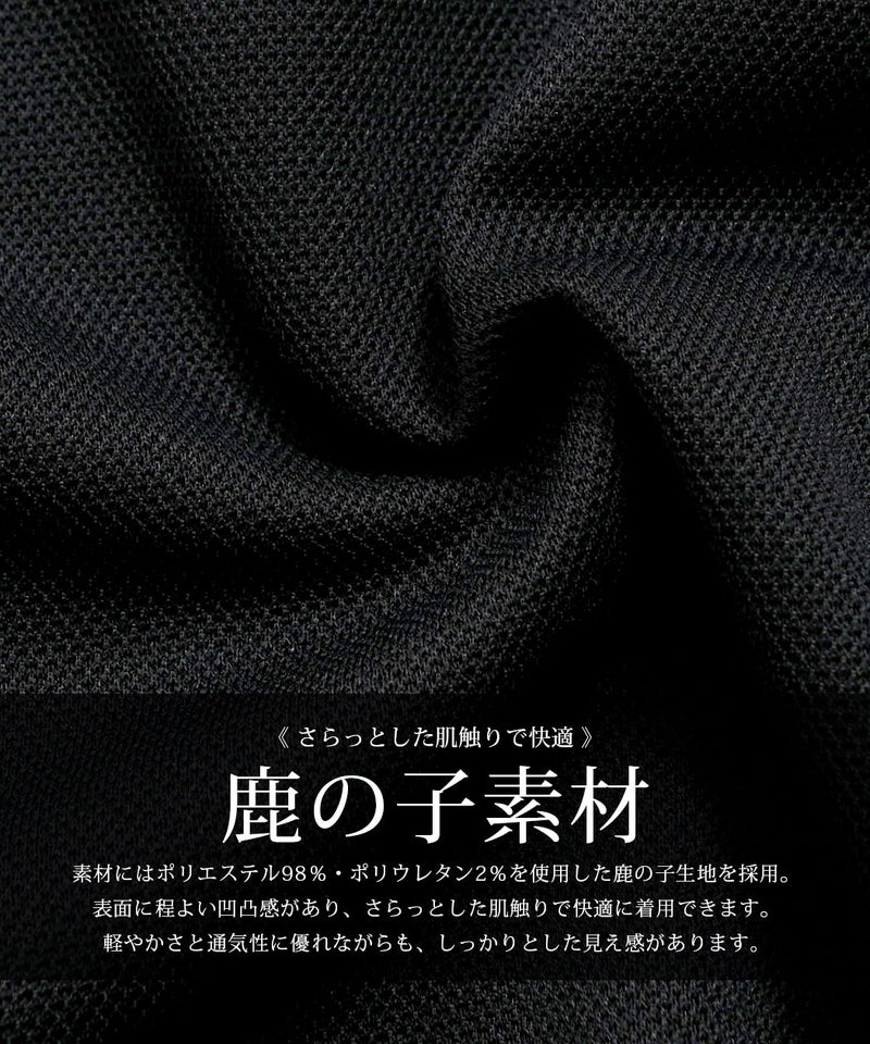 素材にはポリエステル98%・ポリウレタン2%を使用した鹿の子生地を採用。
