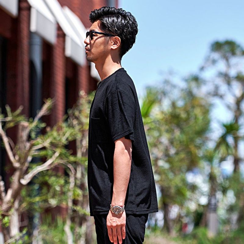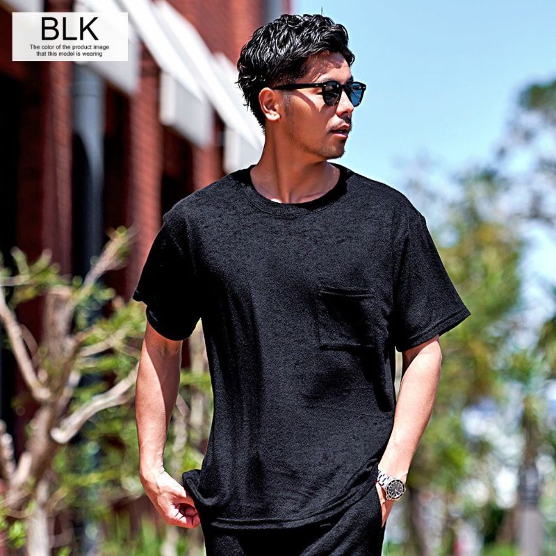 接触冷感 Tシャツ メンズ 半袖 半袖Tシャツ パイル タオル おしゃれ カットソー ルームウェア ルームウエア 部屋着 無地 胸ポケット スリム 細身 ストレッチ ブラック CavariA(キャバリア)接触冷感パイル半袖Tシャツ/全5色