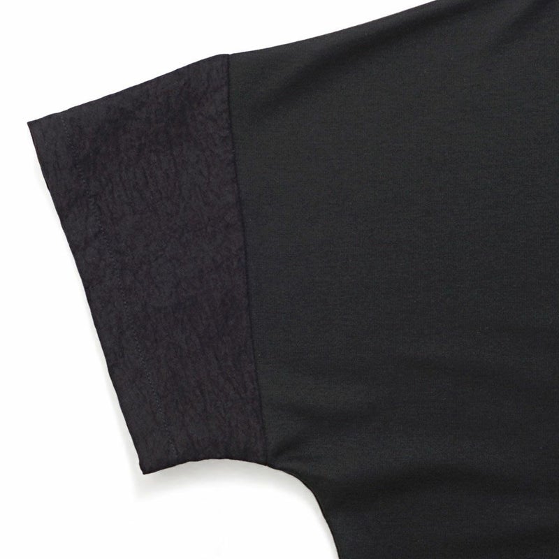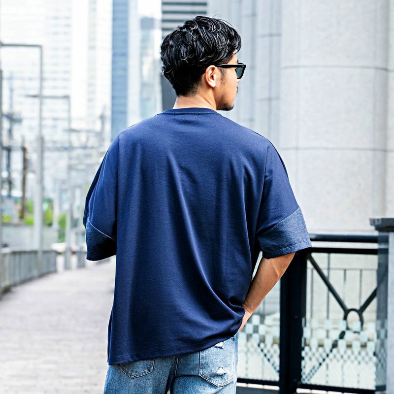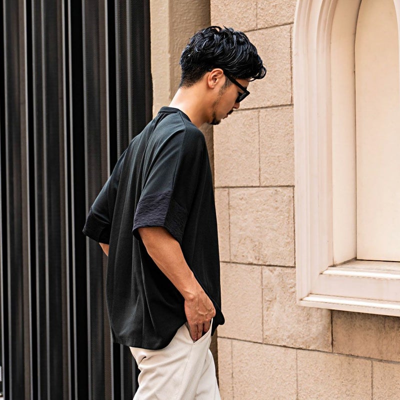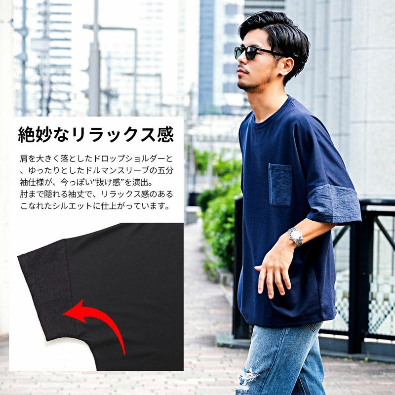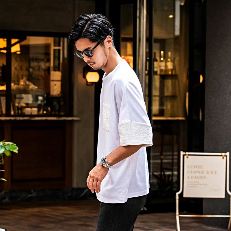 袖と胸ポケットの切り替えデザインがアクセントになった、上品さとラフさを兼ね備えたドルマンTシャツ。