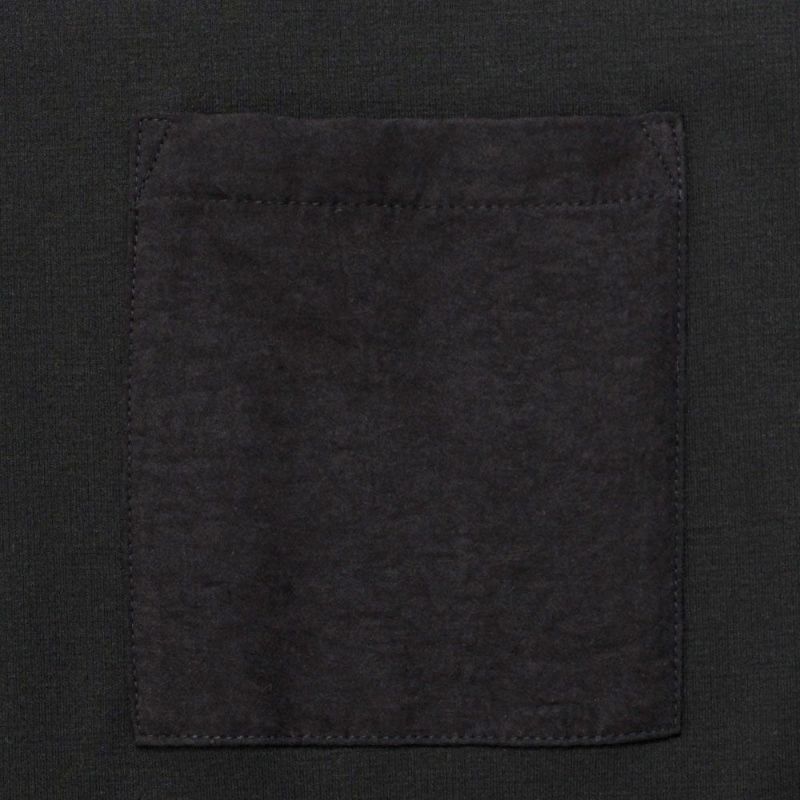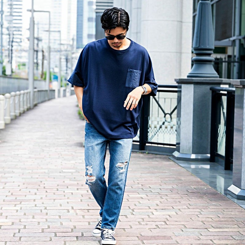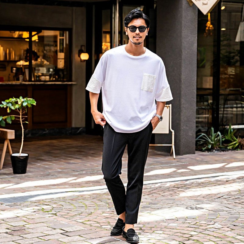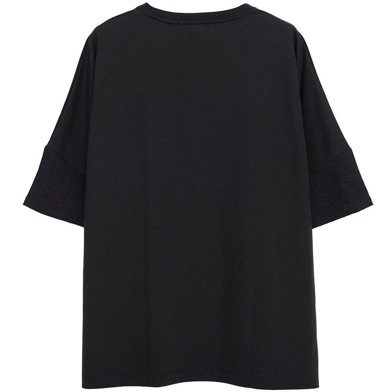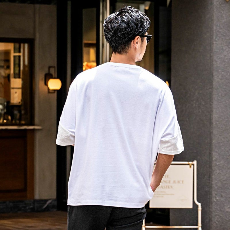 袖と胸ポケットの切り替えデザインがアクセントになった、上品さとラフさを兼ね備えたドルマンTシャツ。