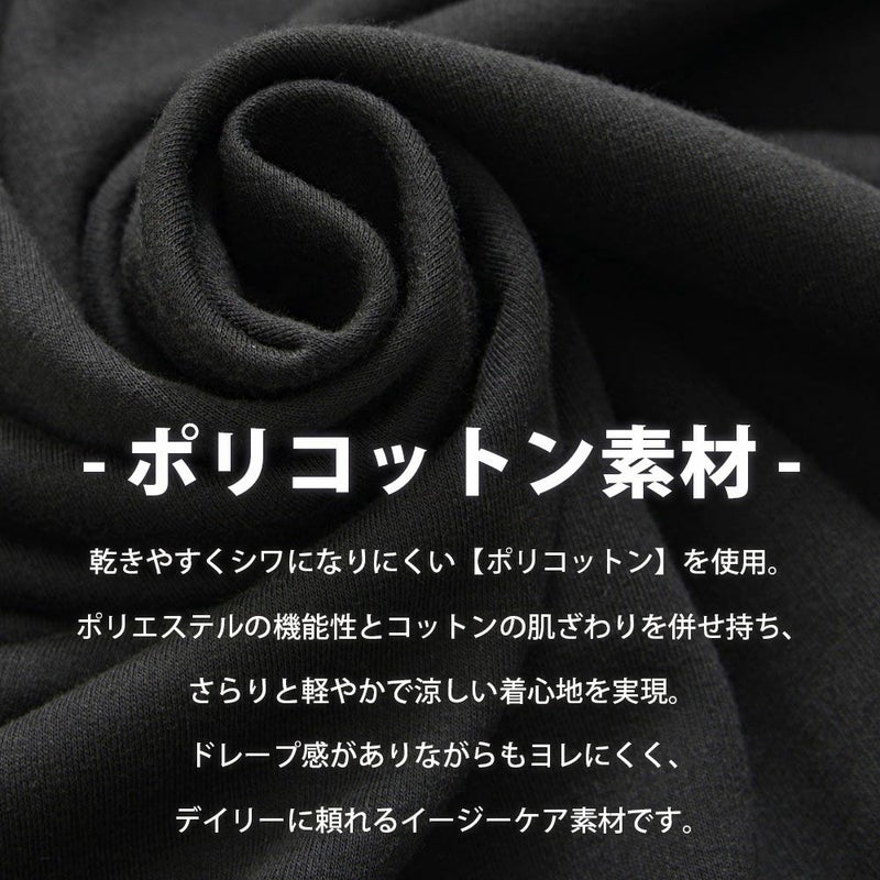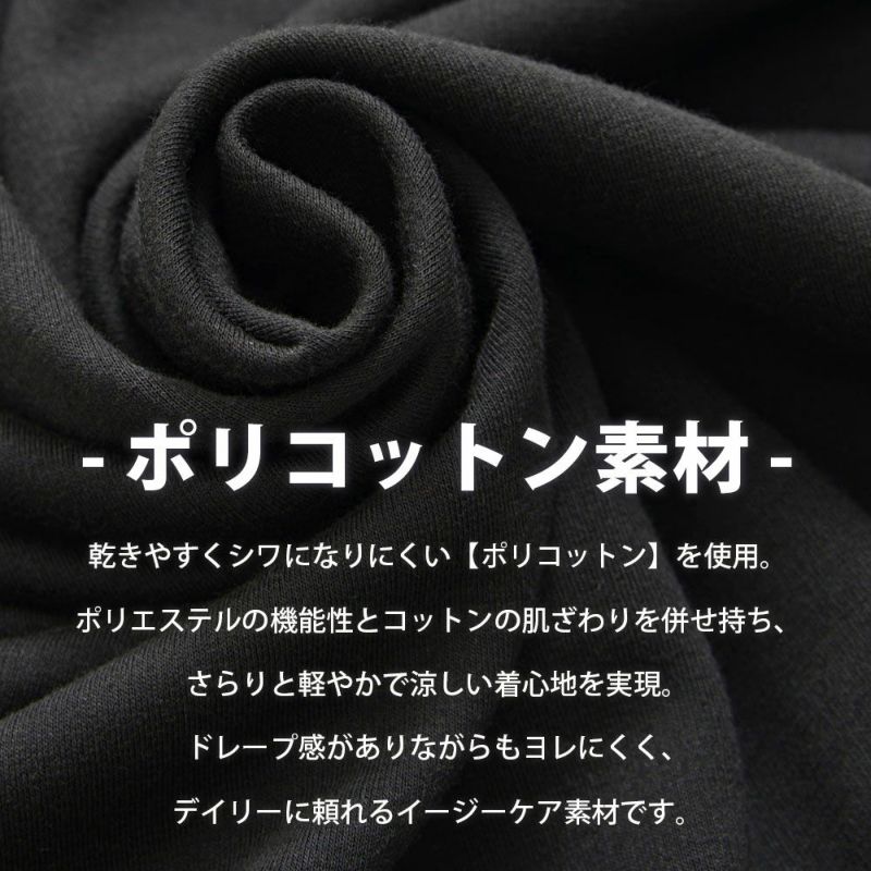素材には、乾きやすくシワになりにくい【ポリコットン】を使用。ポリエステルの機能性とコットンの肌ざわりを併せ持ち、さらりと軽やかで涼しい着心地を実現。