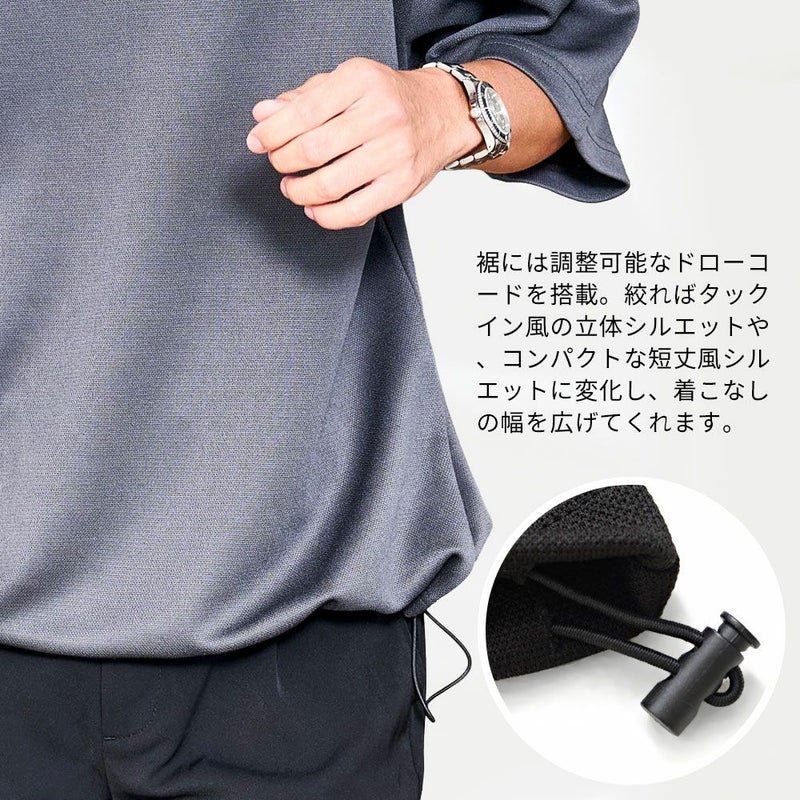 裾には調整可能なドローコードを搭載。絞ればタックイン風の立体シルエットや、コンパクトな短丈風シルエットに変化し、着こなしの幅を広げてくれます。