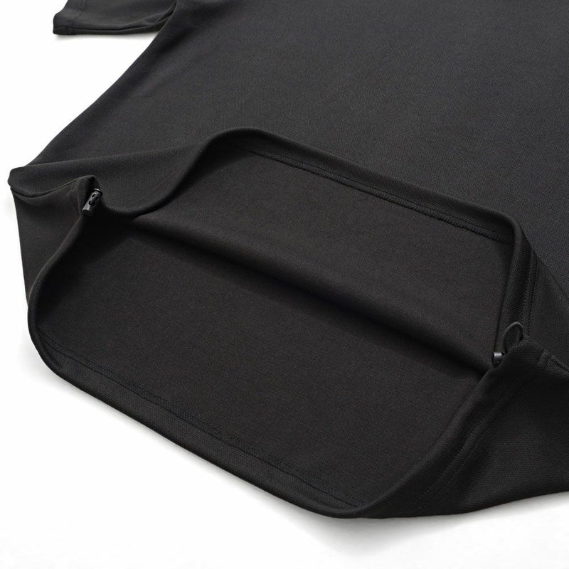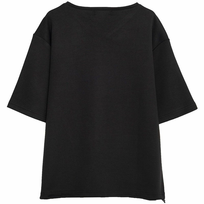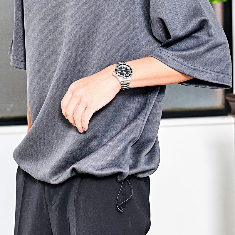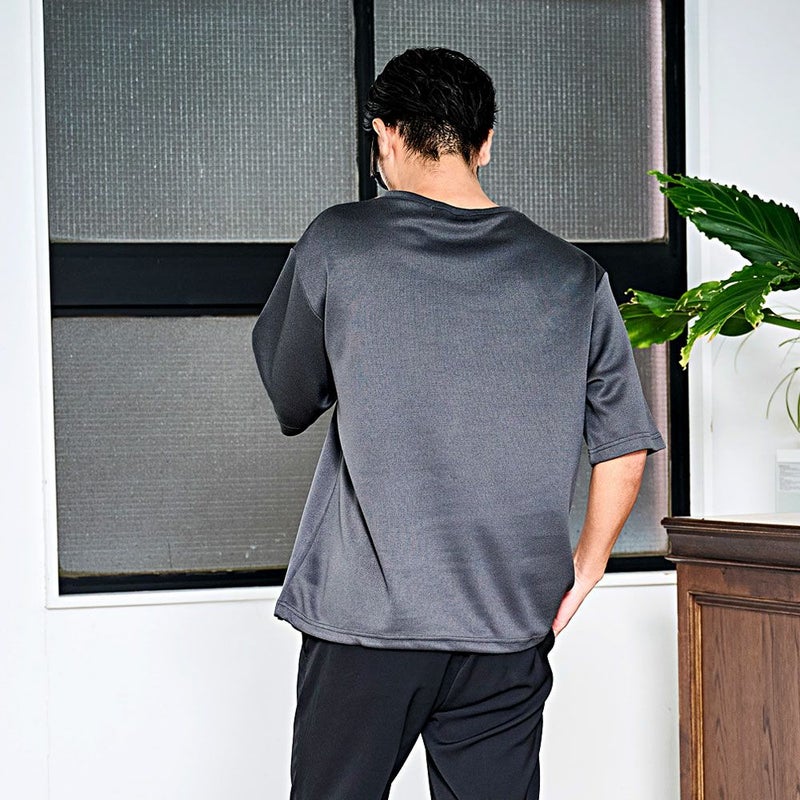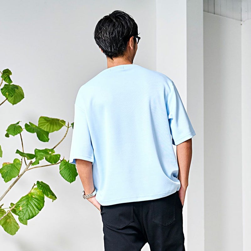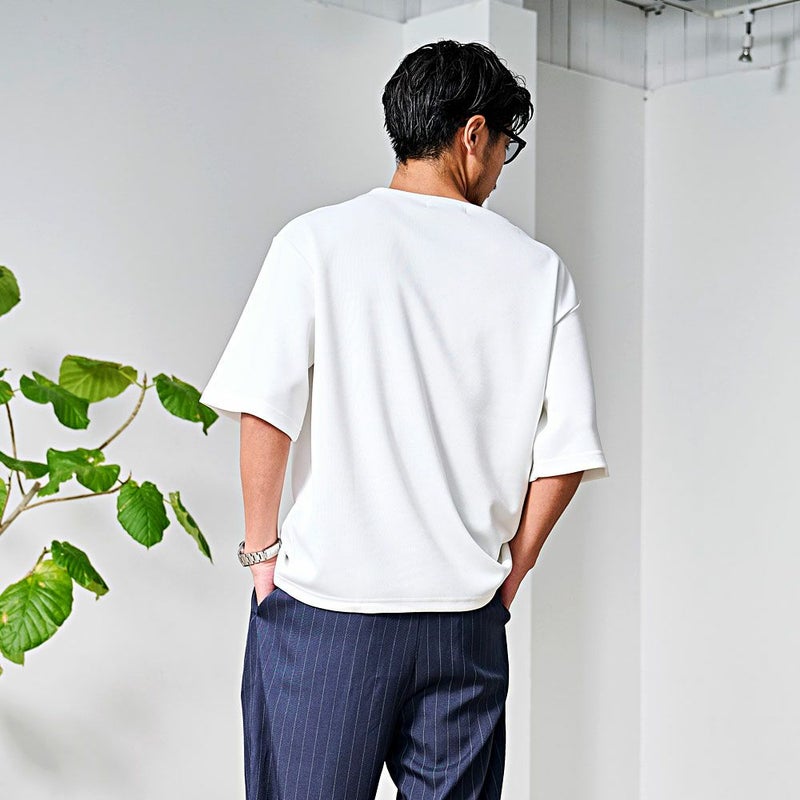 肩のラインが落ちるドロップショルダー仕様と、程よく肉厚でサラリとした質感のポリエステル素材により、リラックス感のある抜け感スタイルを自然に表現します。