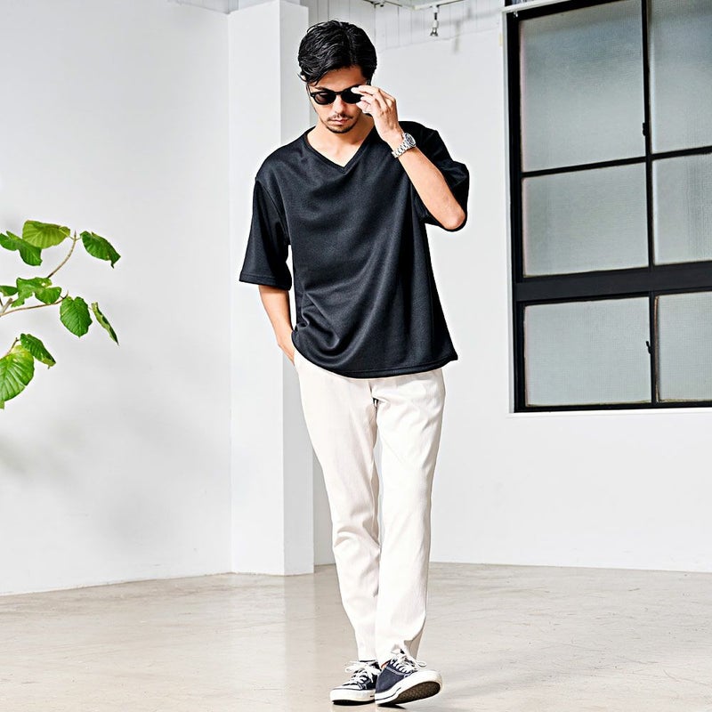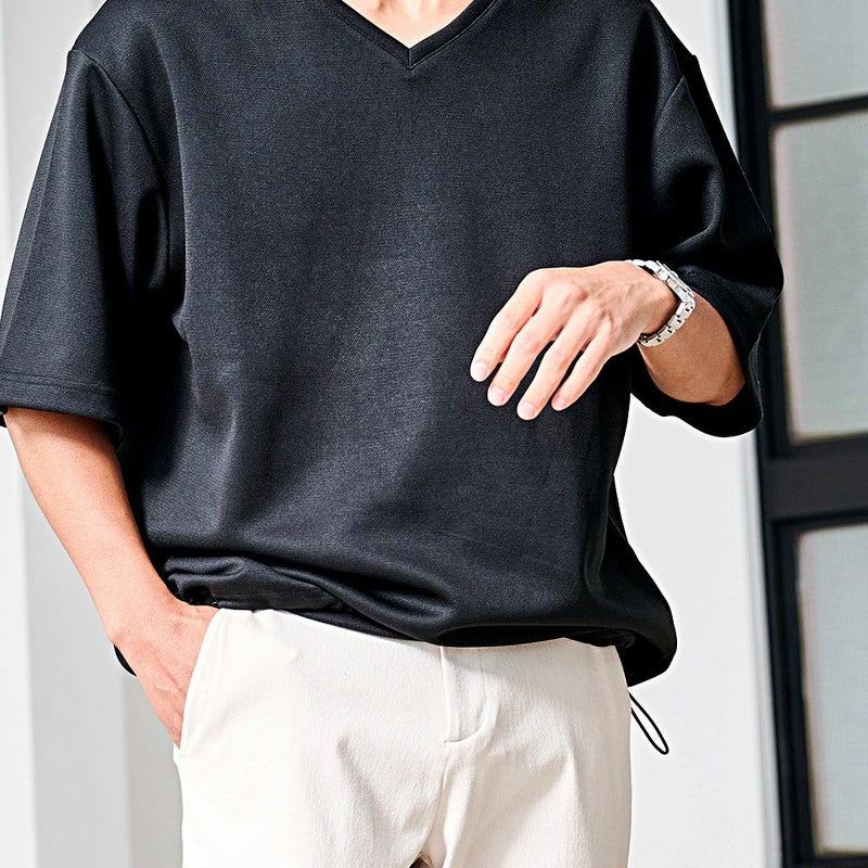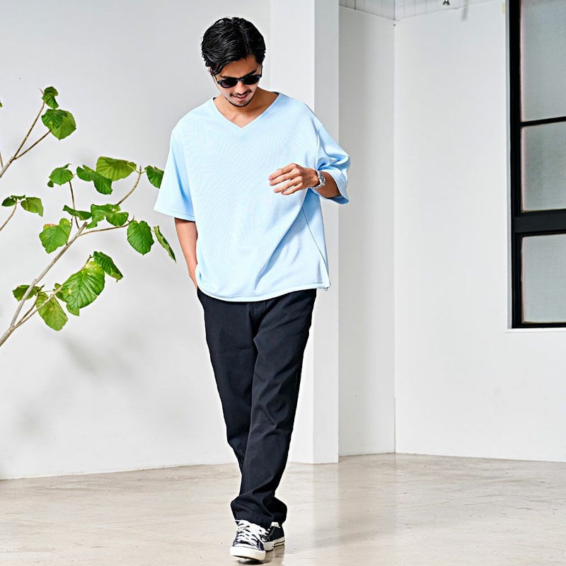 首元がすっきり見える浅めのVネックデザインと、ゆとりのあるビッグシルエットで、1枚でトレンド感を演出できる夏の主役トップス。