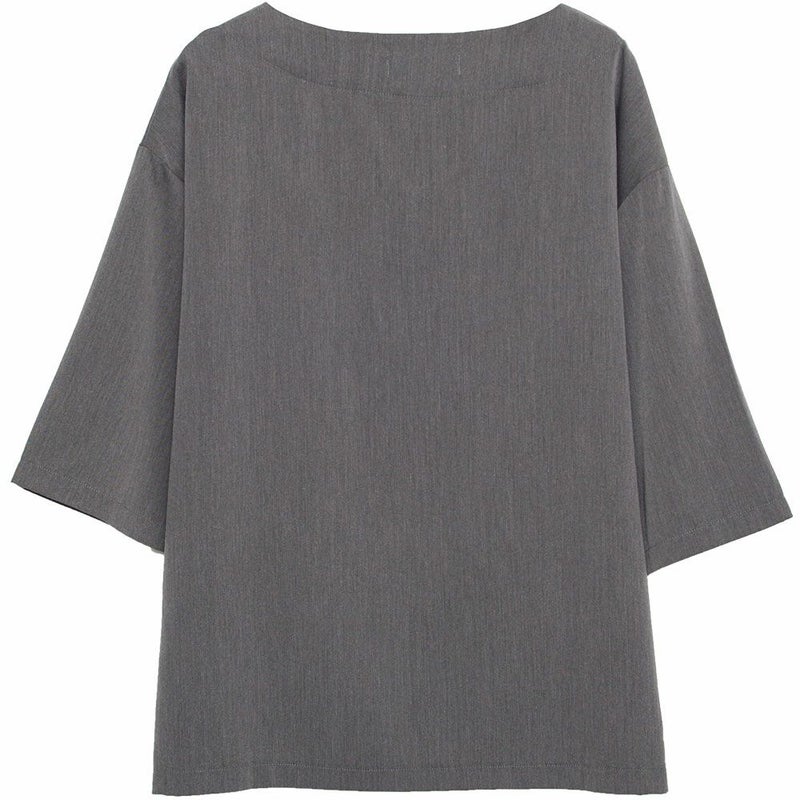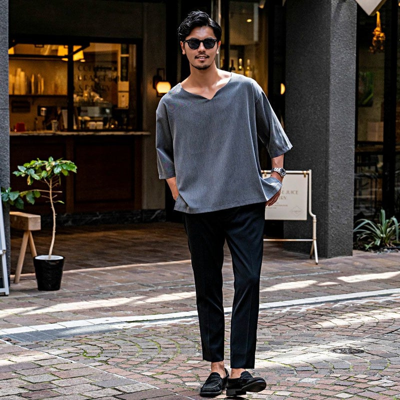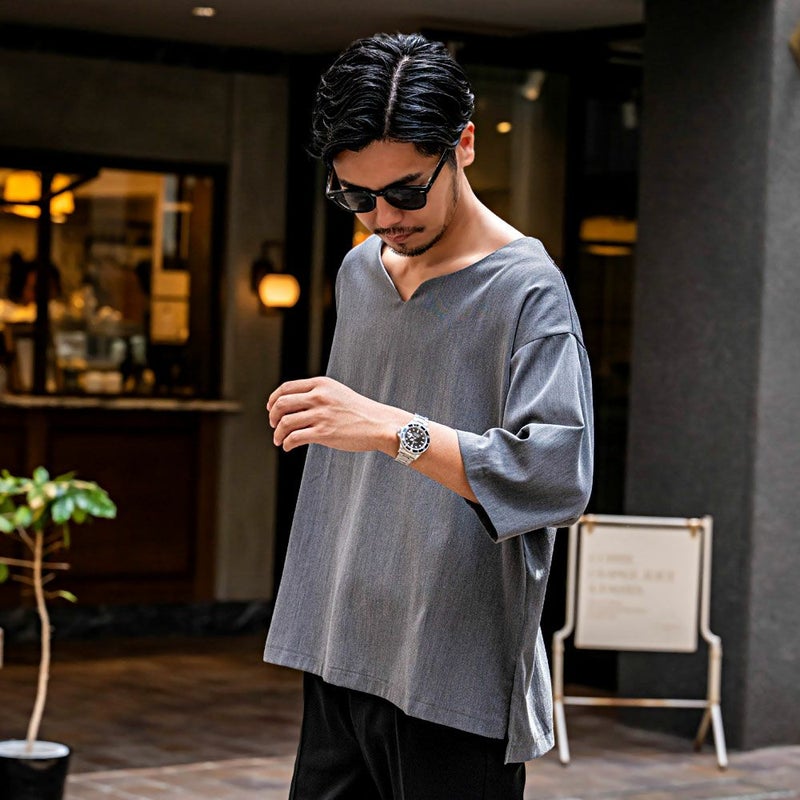 V字カットのネックデザインが程よく抜け感を演出し、春夏の軽やかなスタイリングにぴったりです。
