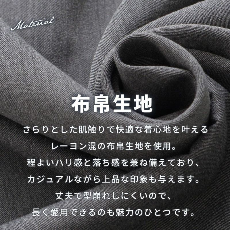 素材には、さらりとした肌触りで快適な着心地を叶えるレーヨン混の布帛生地を使用。