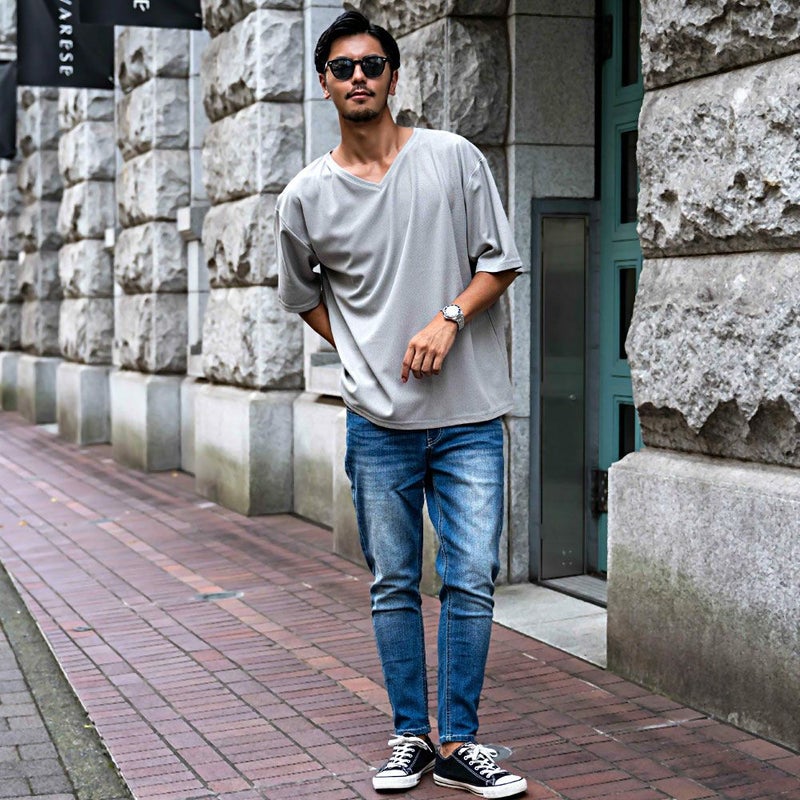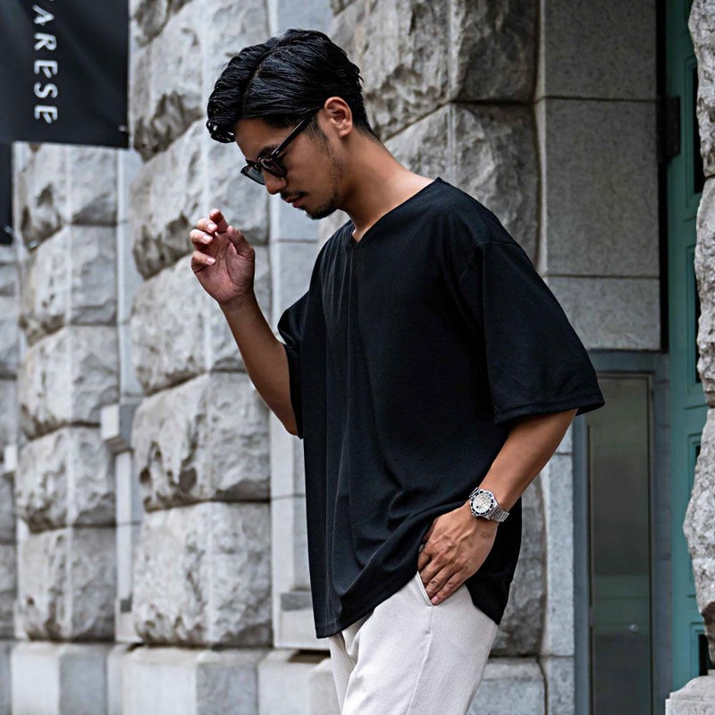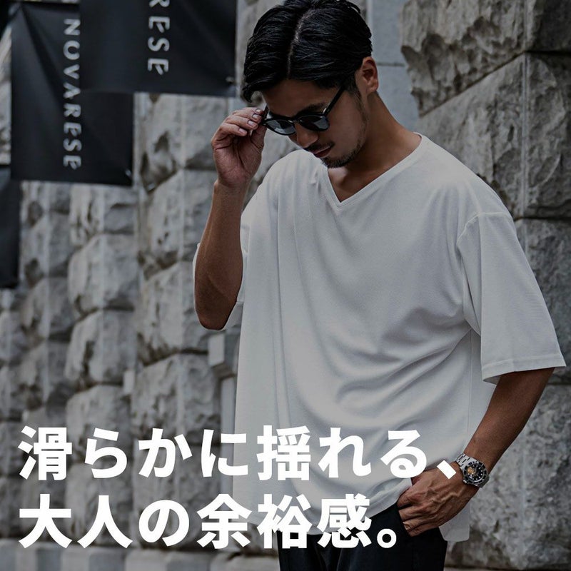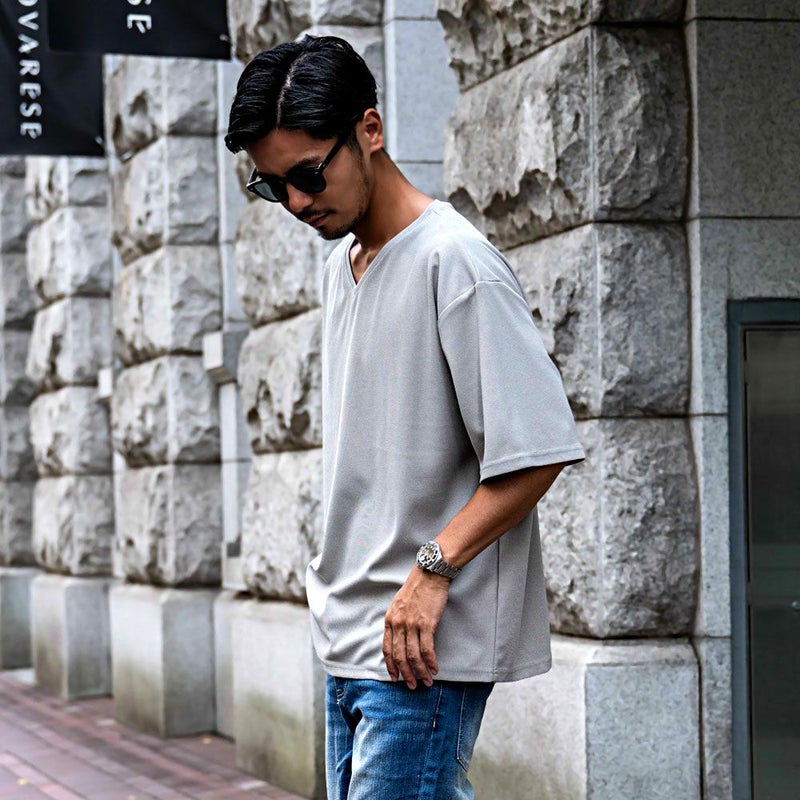 首元をすっきりと見せる浅めのVネックデザインと、トレンドのビッグシルエットが融合した1枚で、こなれ感のある大人カジュアルスタイルを演出。