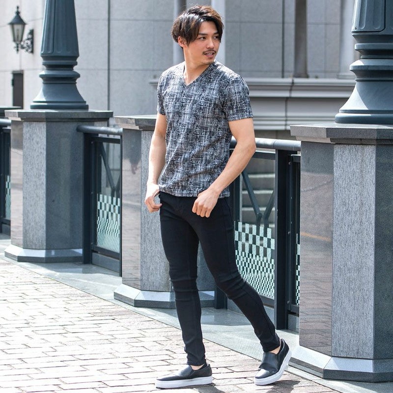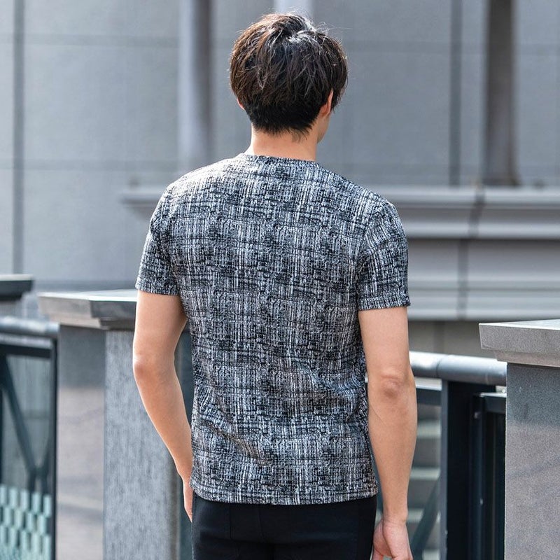 表面にモザイクチェック柄を施した生地感が上品で贅沢な雰囲気を演出する半袖Tシャツ。