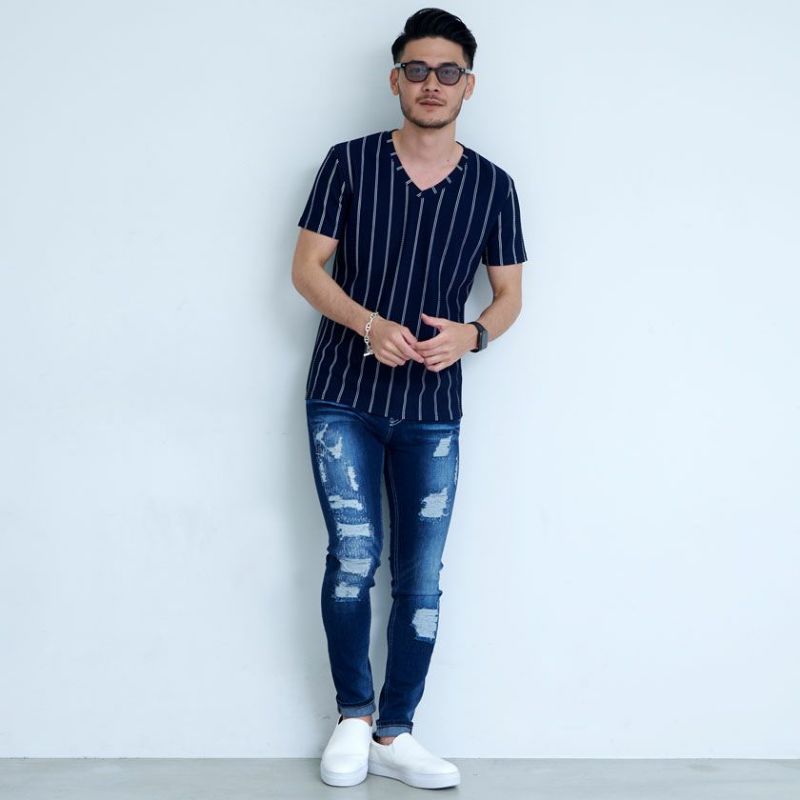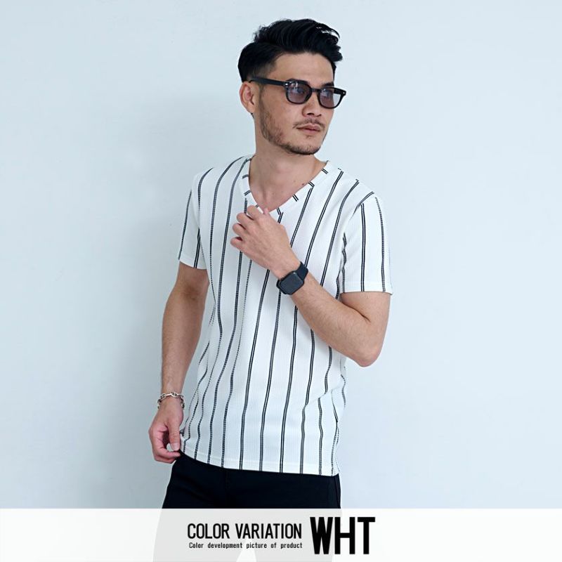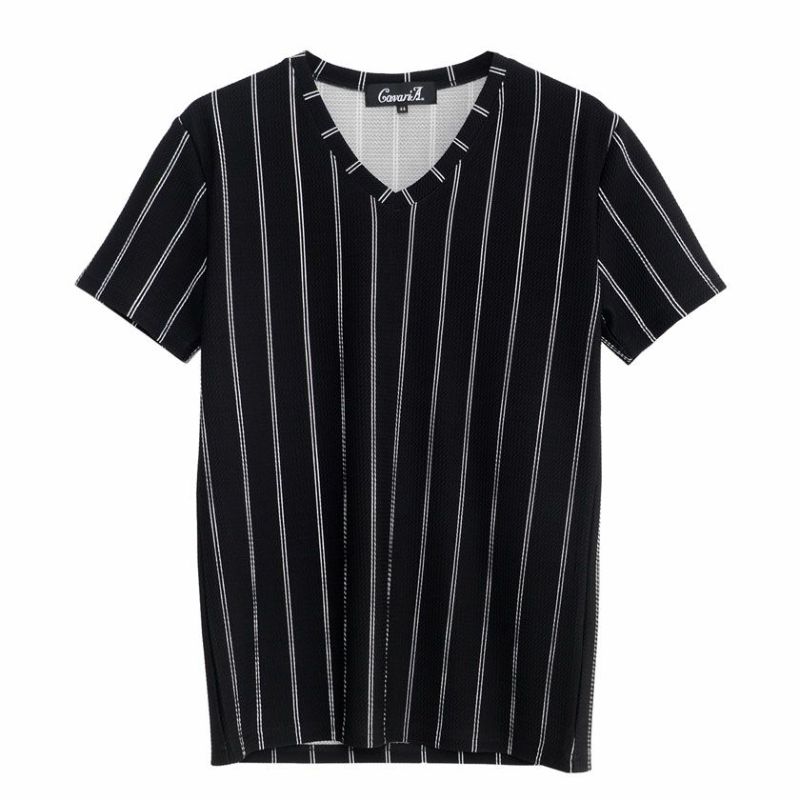 暑い日でも涼しくおしゃれに!シンプルで着心地抜群の半袖Tシャツ。 CavariA(キャバリア)ストライプ柄Vネック半袖Tシャツ/全3色