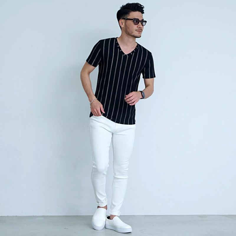 少し細身のシルエットとVネックがすっきりとした印象に見せてくれます。 生地は伸縮性もあり、動きやすく着心地も抜群。