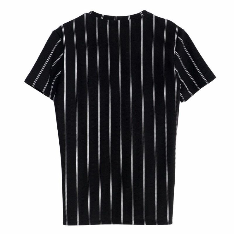 シンプルなストライプ柄の半袖Tシャツ。