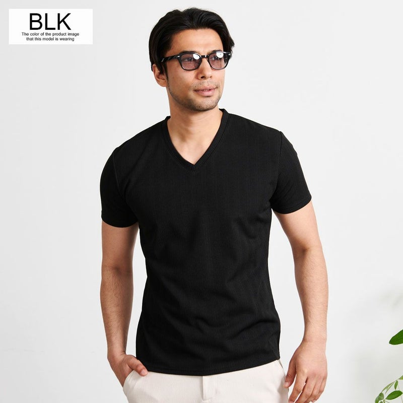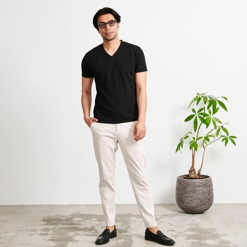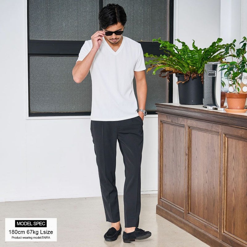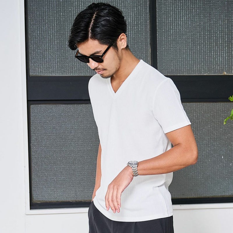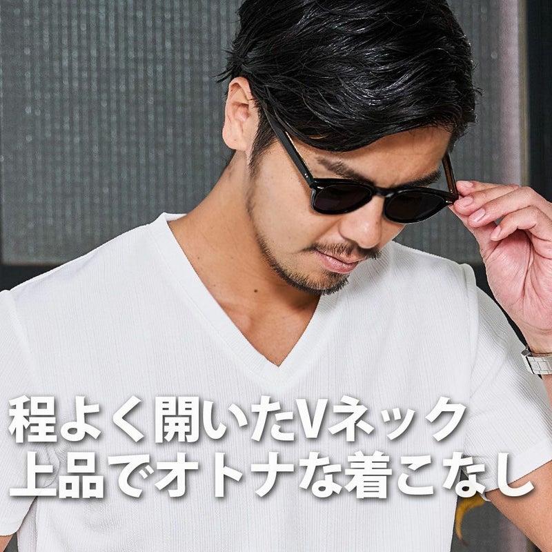 程よく開いたVネックはすっきりとした色気のある首元に魅せてくれます。