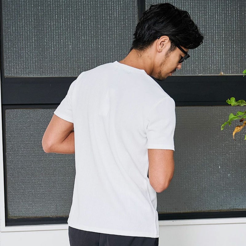 伸縮性のある素材なのでタイトめなサイズ感でもストレスのない着心地を実現。