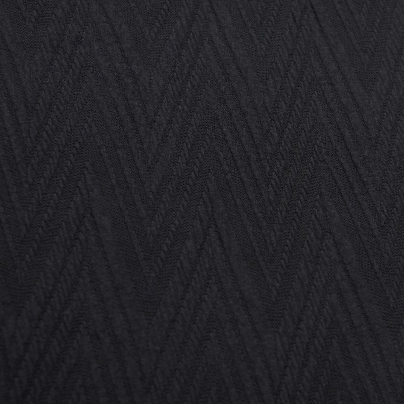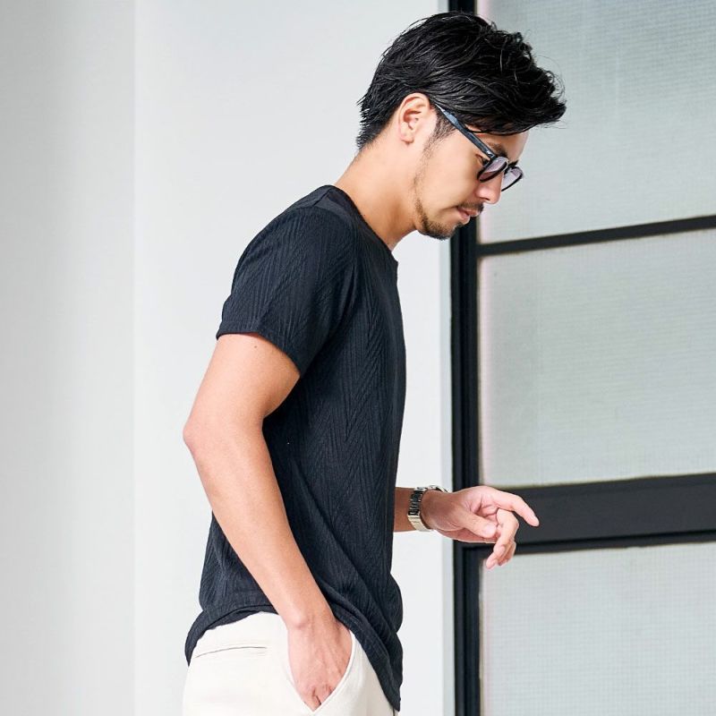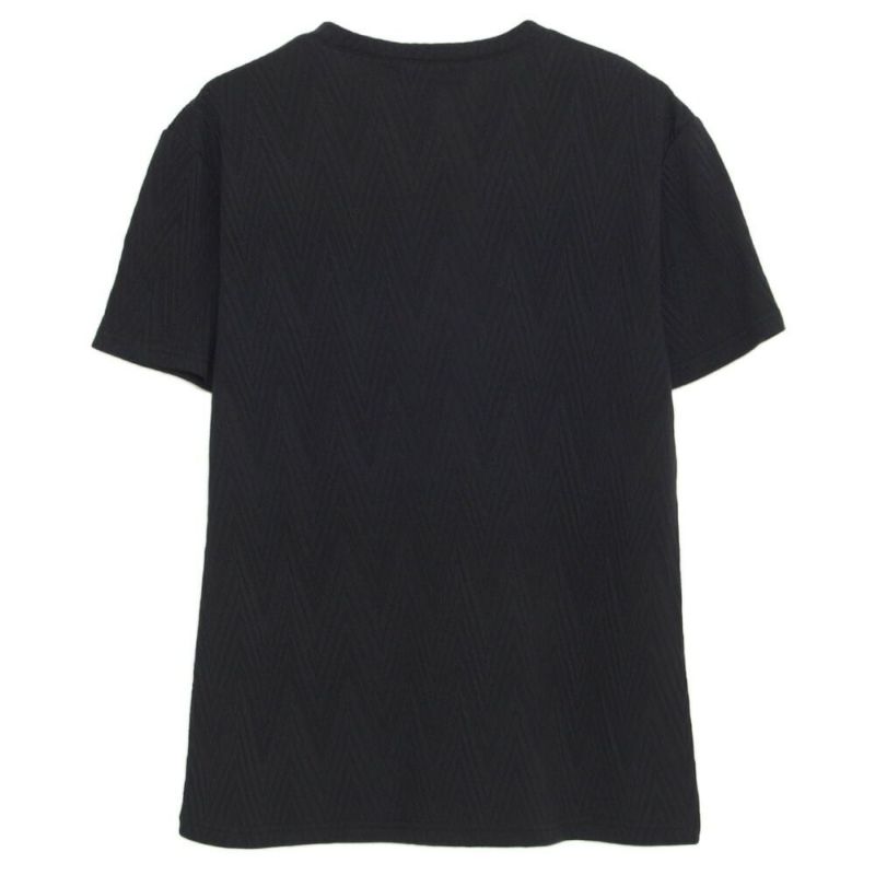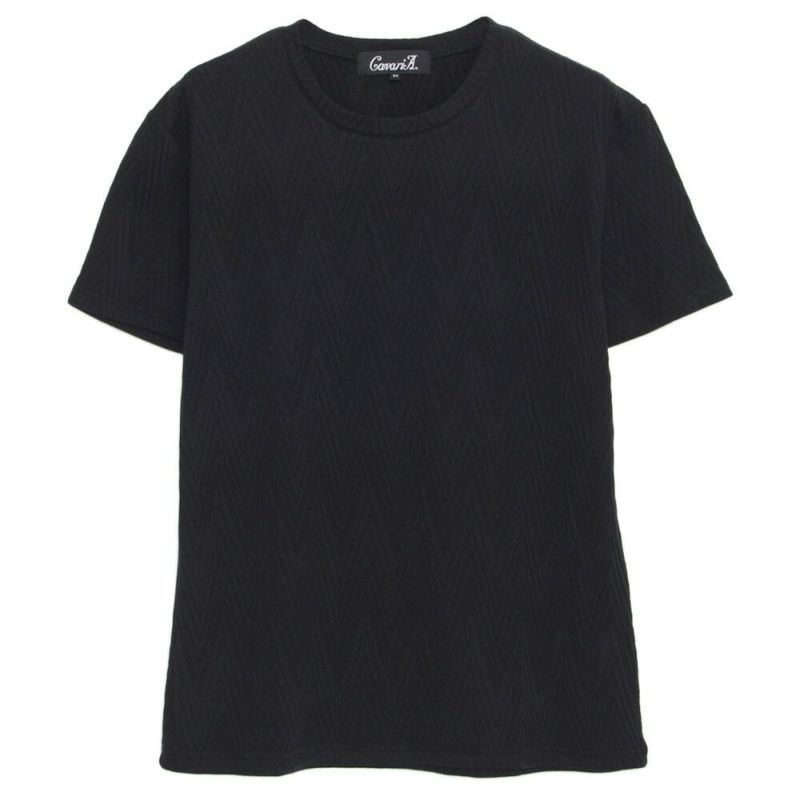 ボディと同色の糸で織り上げた立体的なシェブロン柄が、シンプルながらも高級感漂う仕上がり。スタイリッシュな細身のシルエットが、スマートで男らしい大人の印象を演出してくれる一着。 CavariA(キャバリア)ランダムシェブロン半袖クルーネックTシャツ/全3色