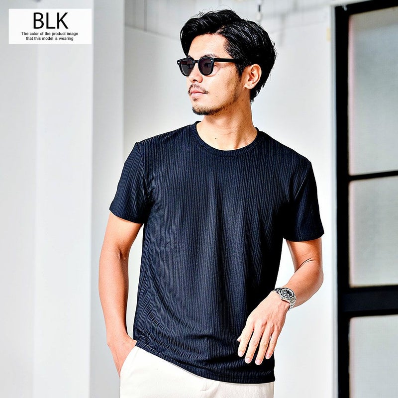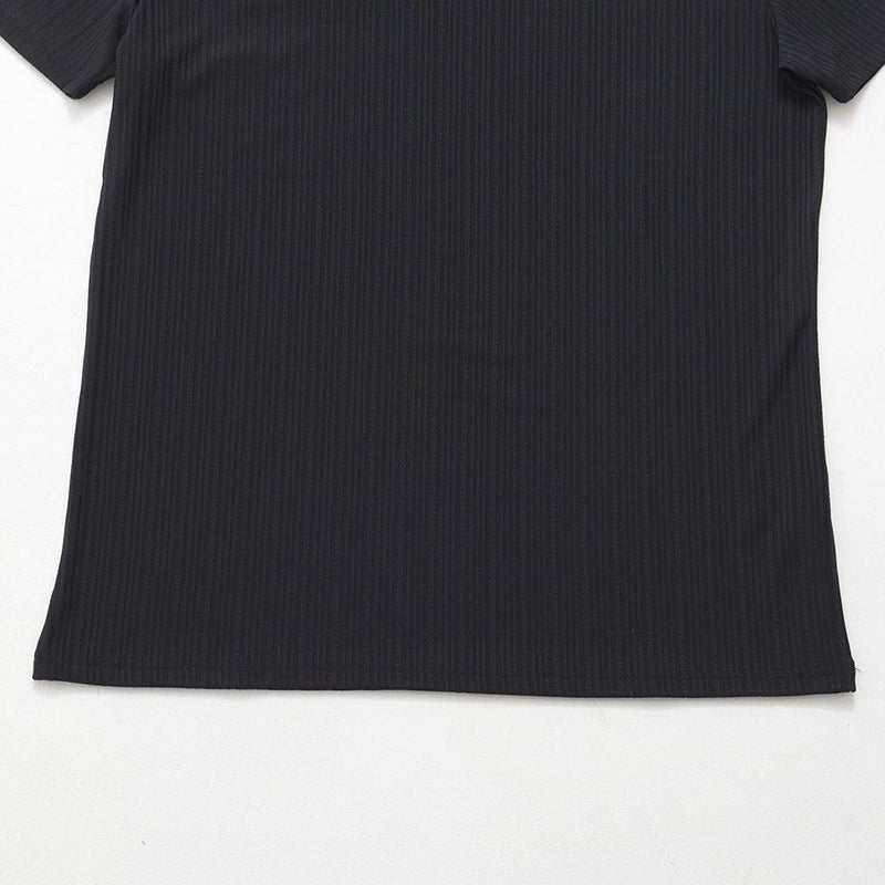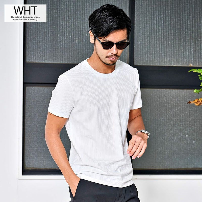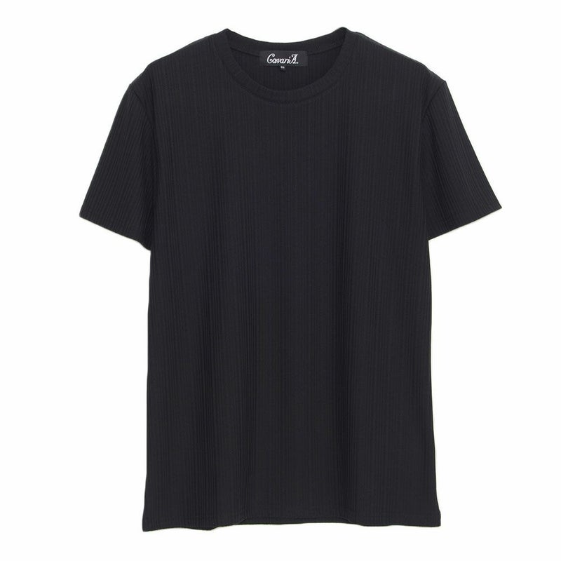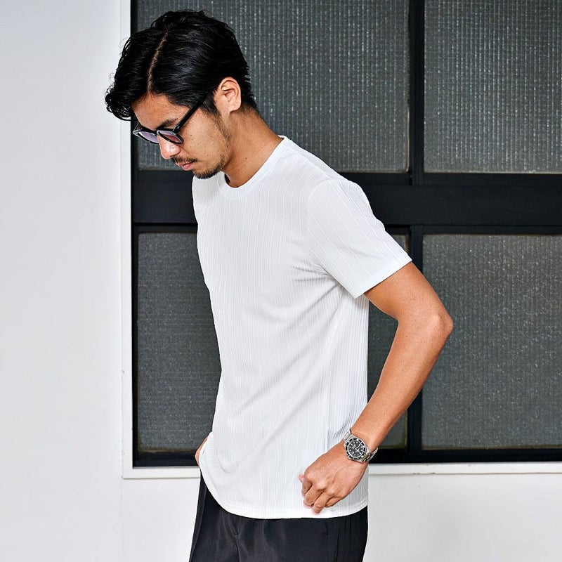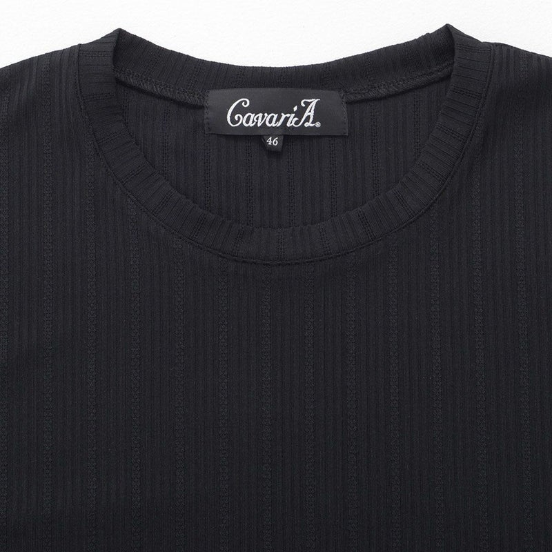 生地に凹凸を持たせ、大小の異なるストライプ柄が特徴のランダムテレコ素材を採用。立体感があることで視覚的なスタイルアップ効果も演出してくれます。 CavariA(キャバリア)テレコジャガード半袖クルーネックTシャツ/全2色