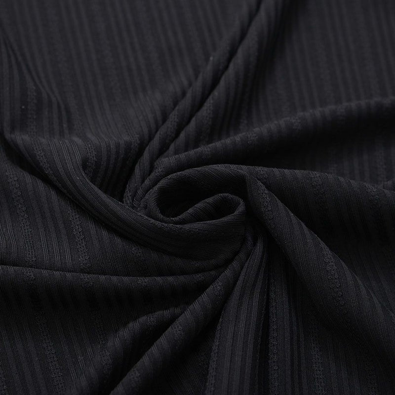 生地に凹凸を持たせ、大小の異なるストライプ柄が特徴のランダムテレコ素材を採用。