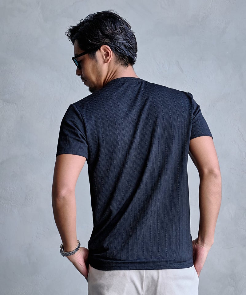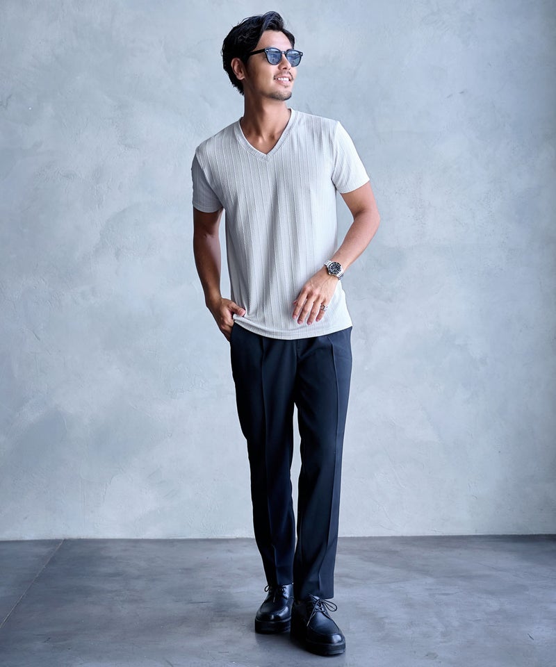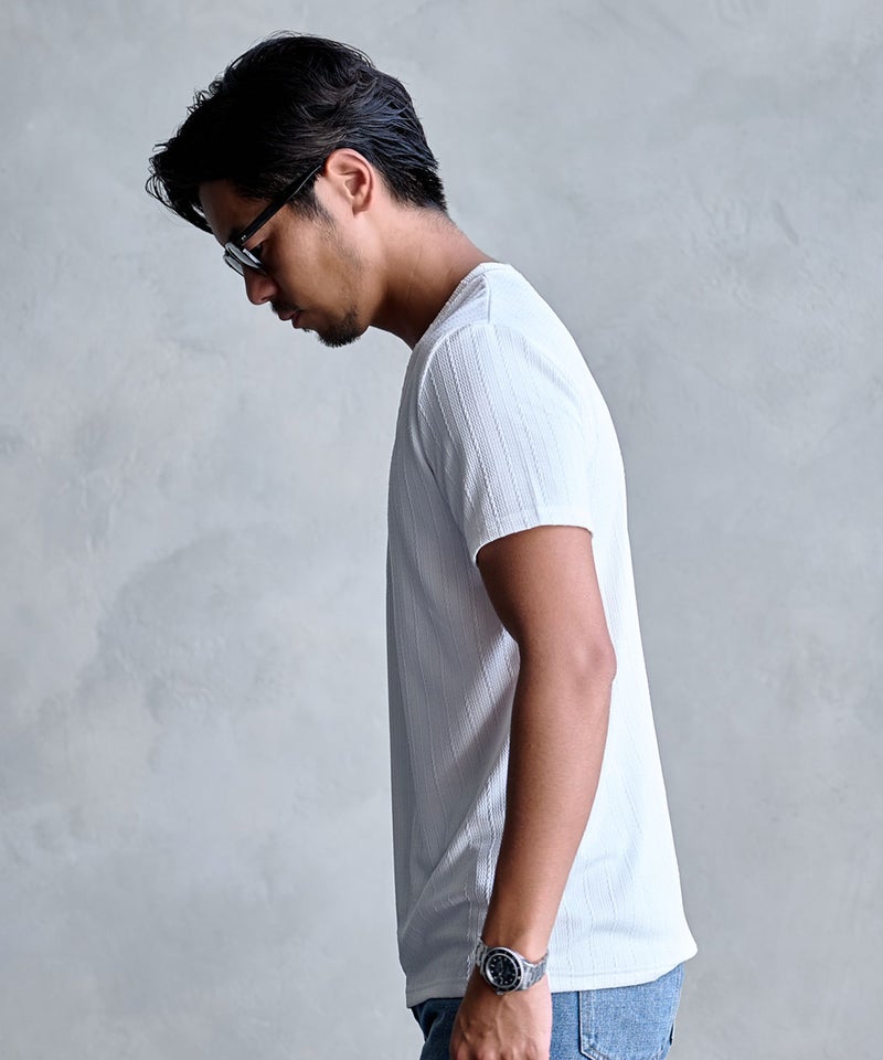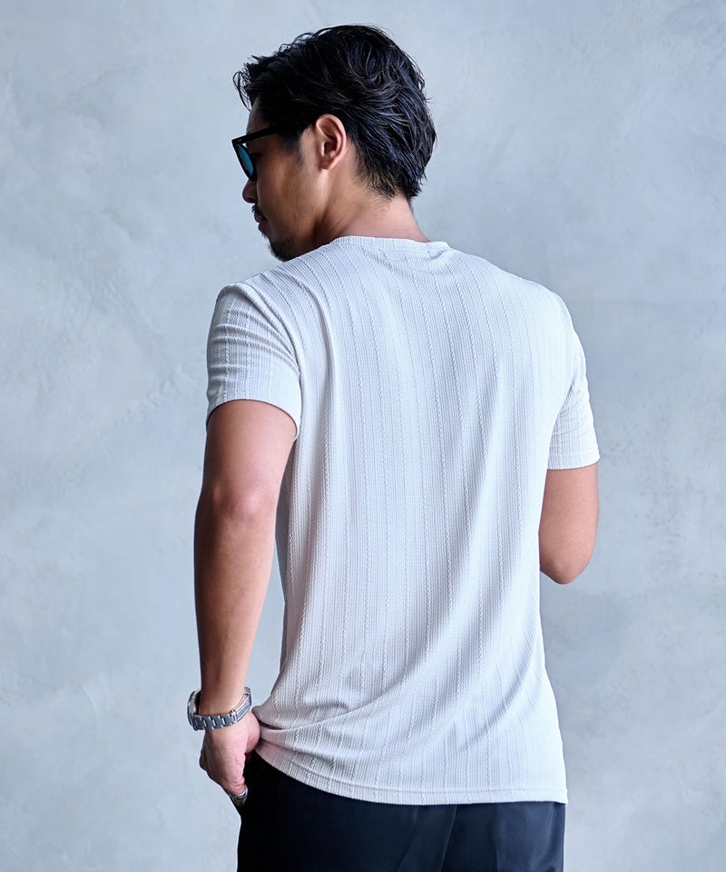 一枚で着てもサマになるのはもちろん、ジャケットやシャツのインナーとしてもバランス良く合わせられる万能なデザインです。