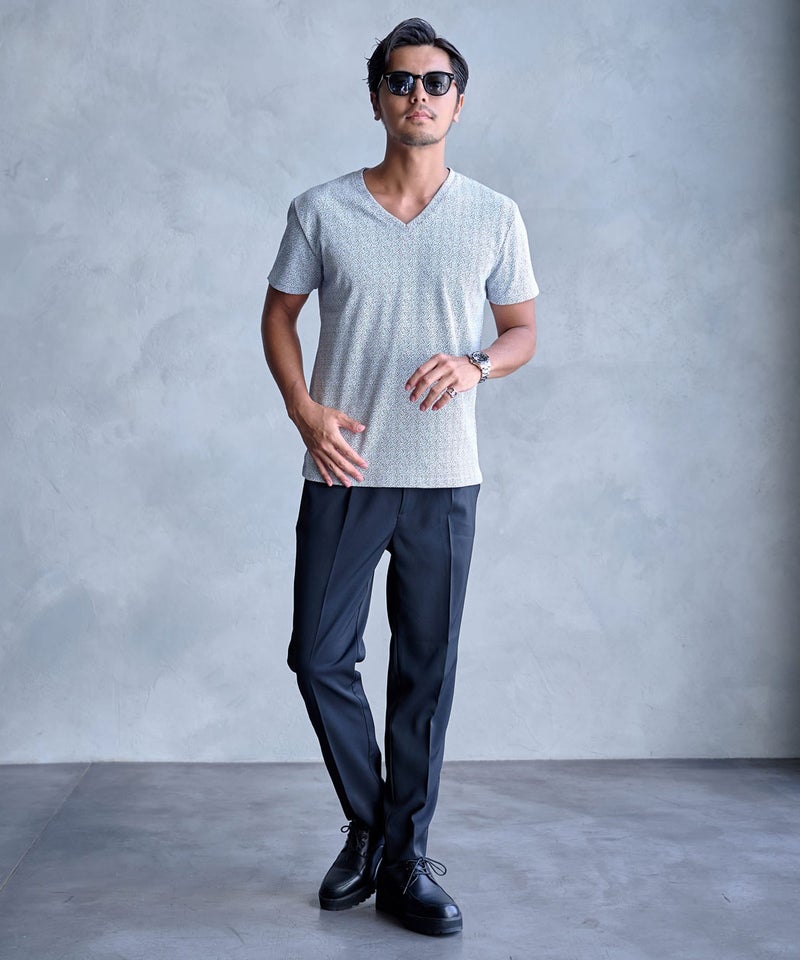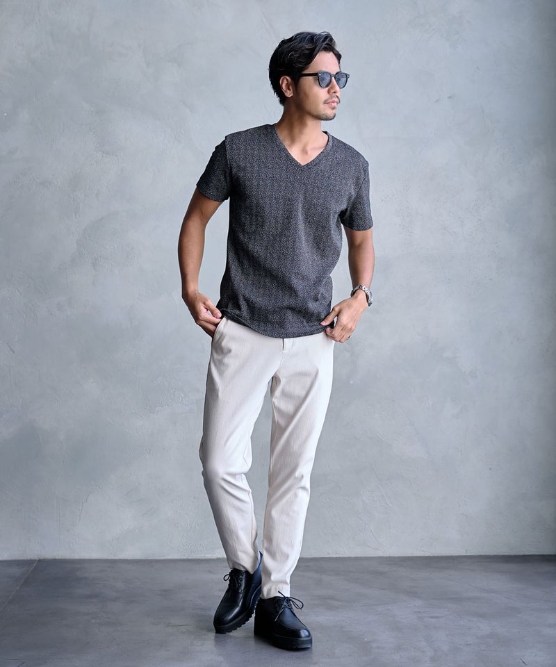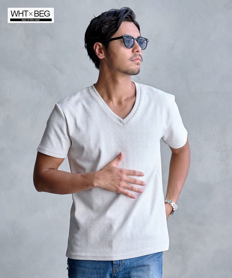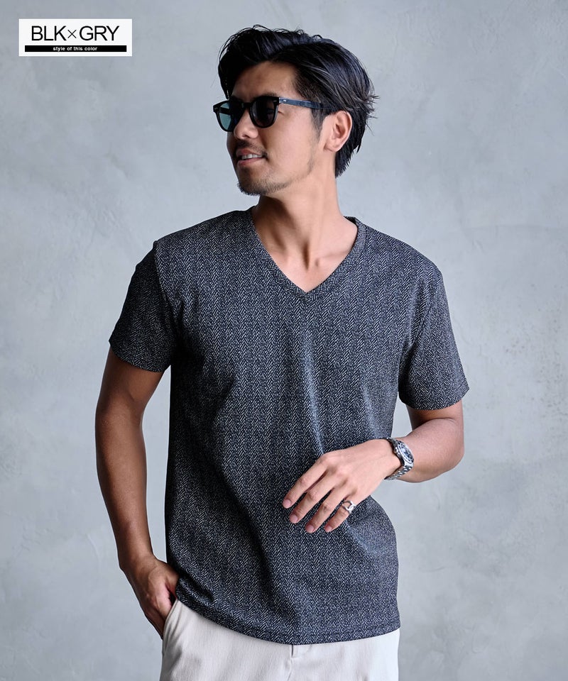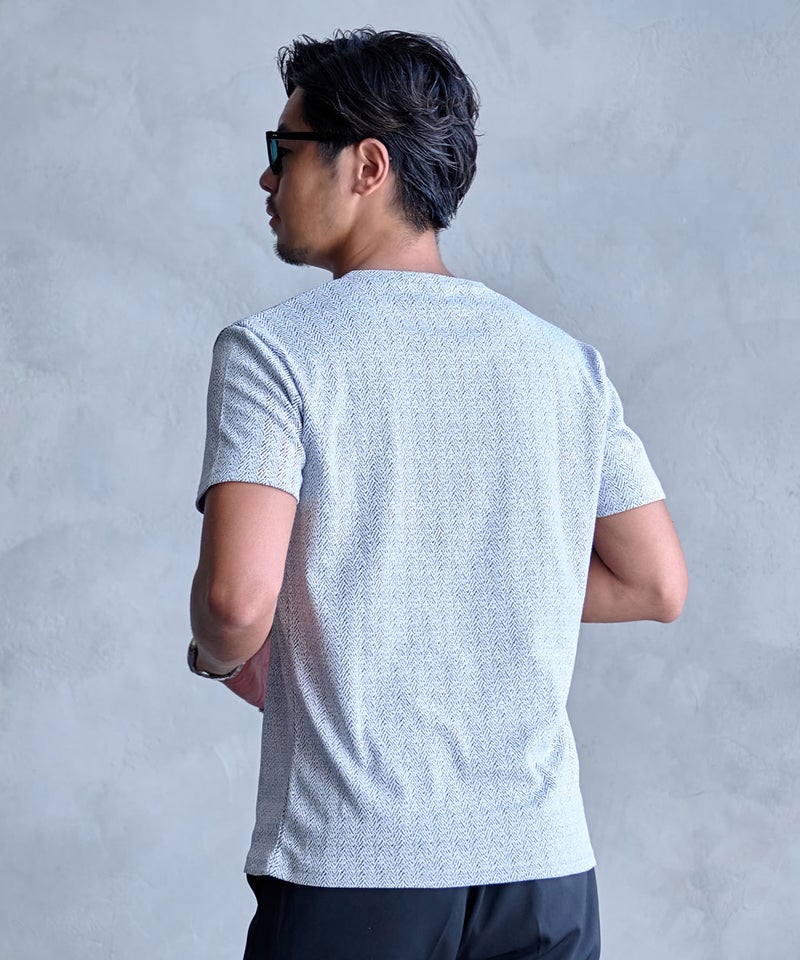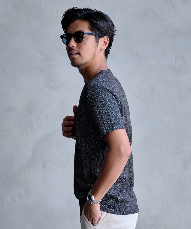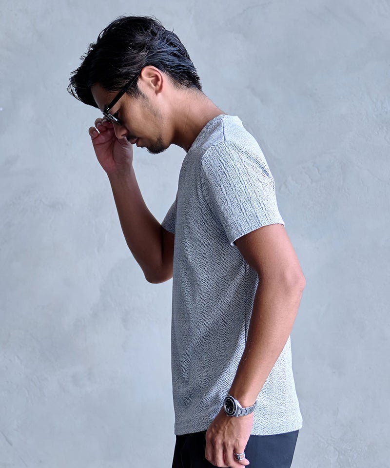 さりげないヘリンボーン柄を全面に施した、大人の雰囲気漂う半袖カットソーです。
