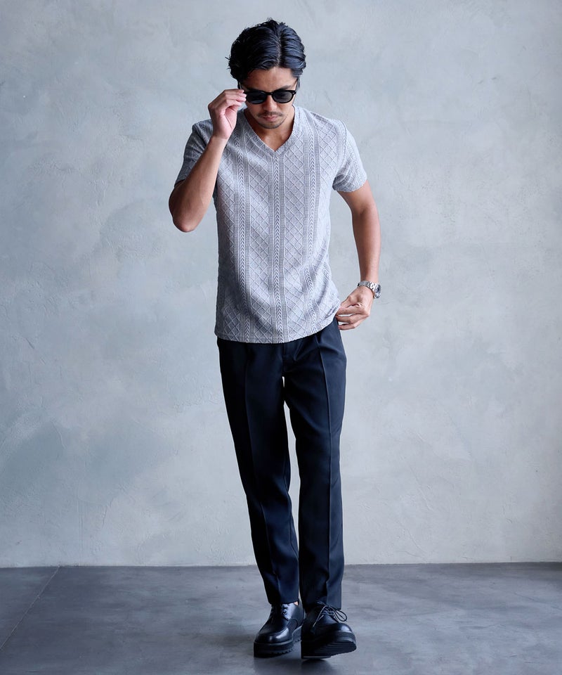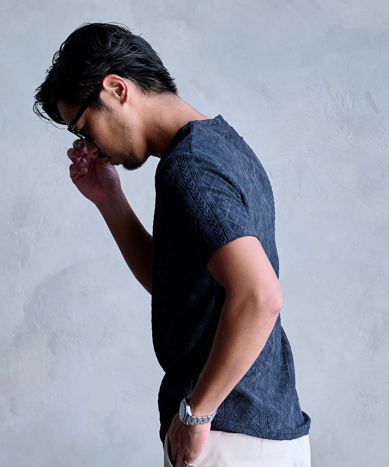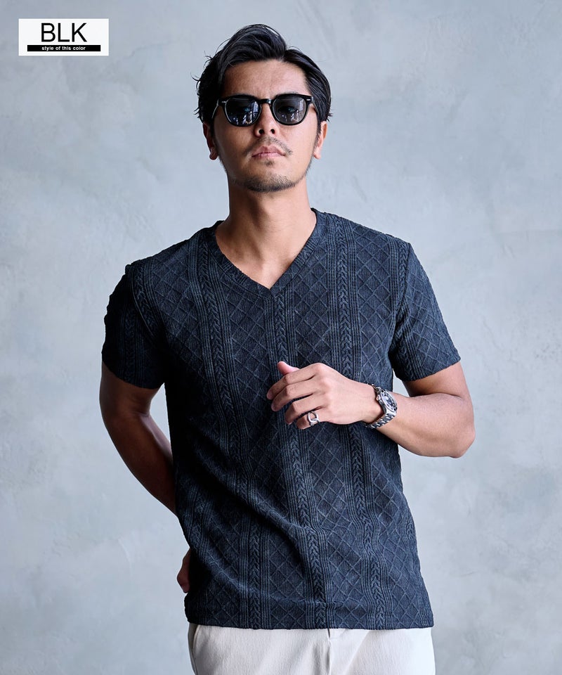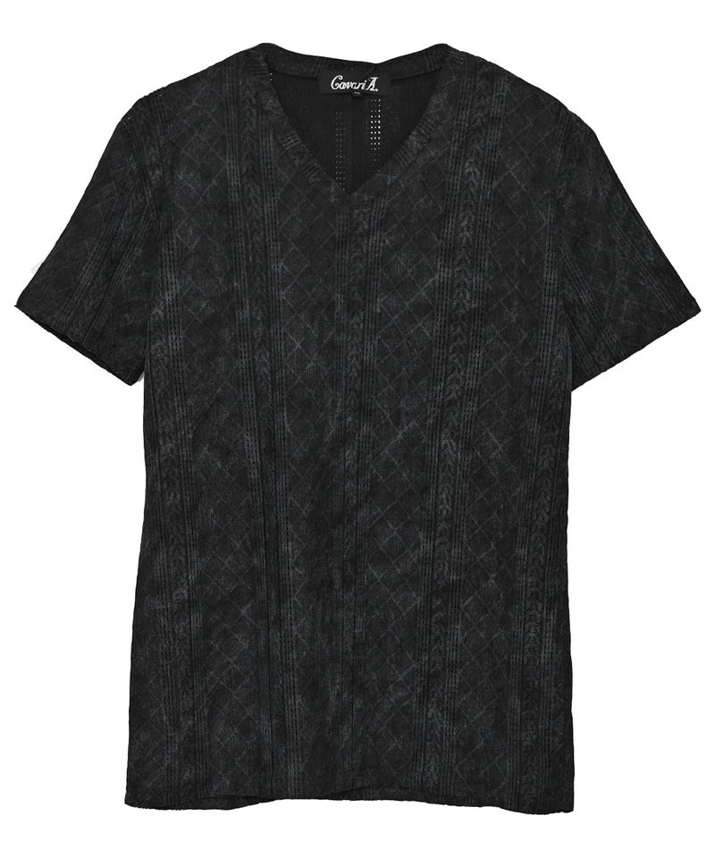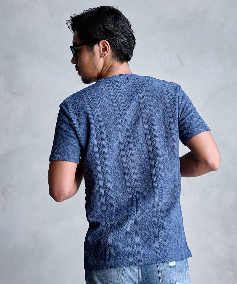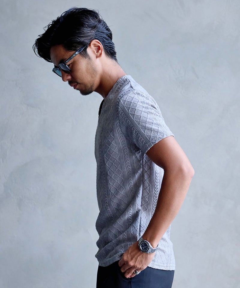 立体感のある格子ケーブルデザインが特徴の半袖VネックTシャツ。