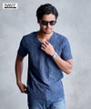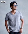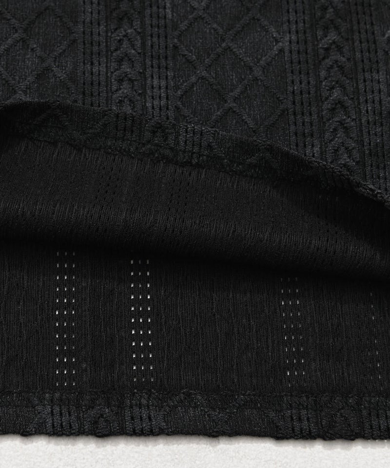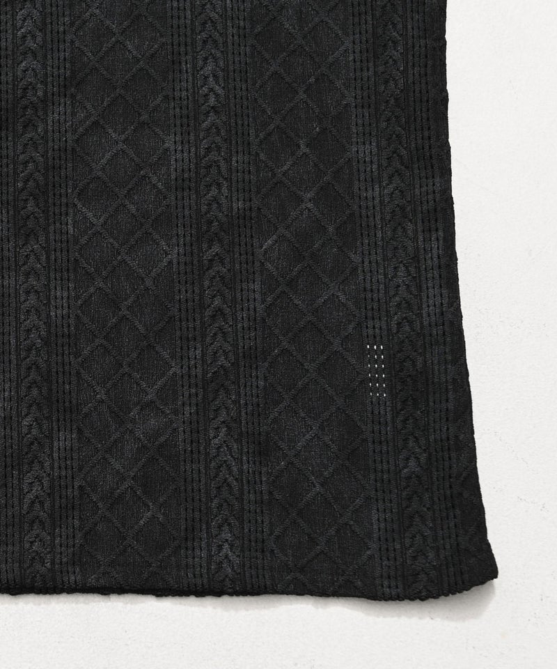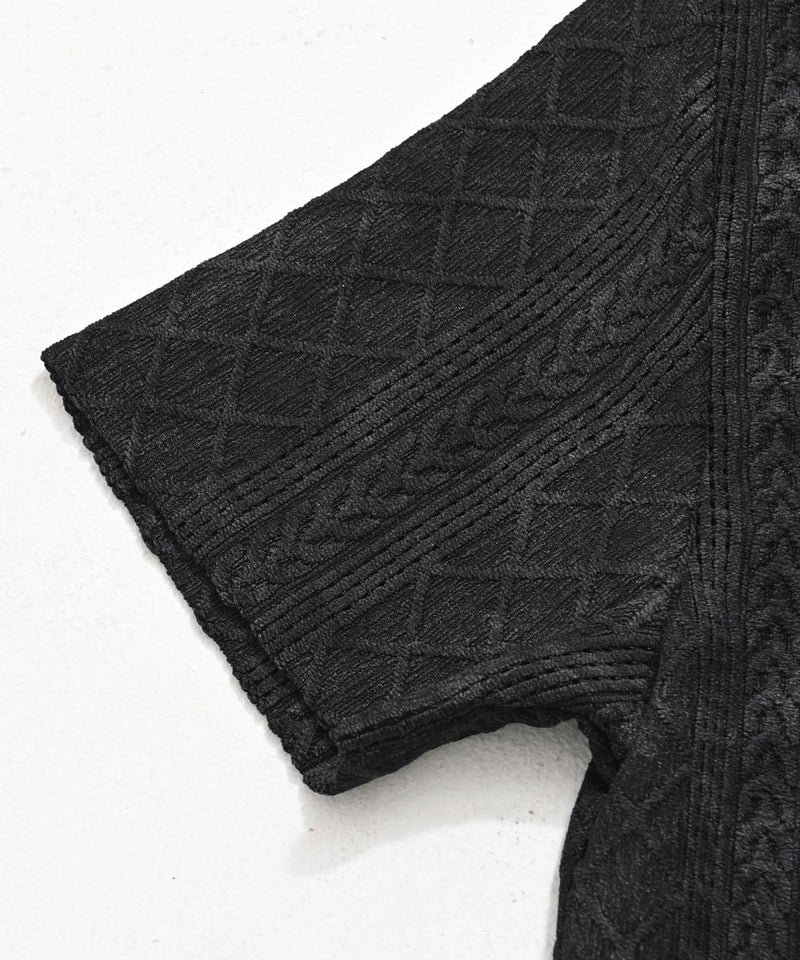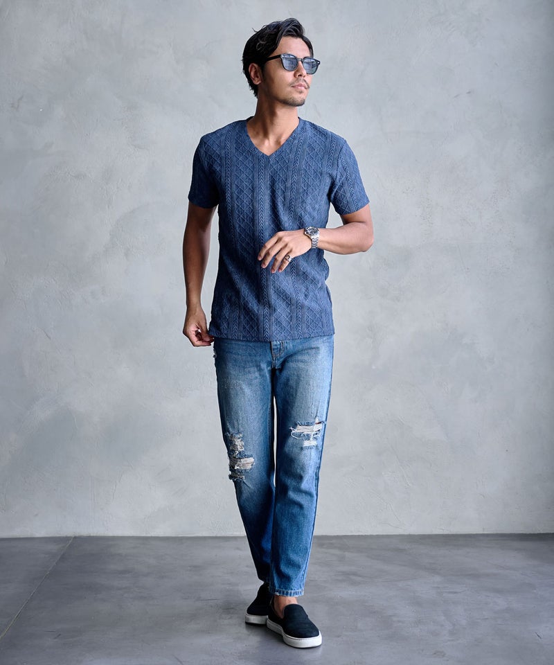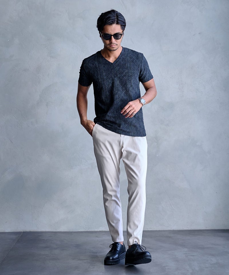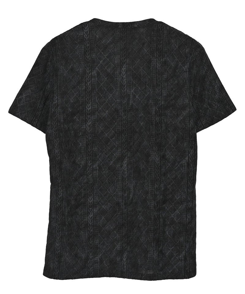 立体感のある格子ケーブルデザインが特徴の半袖VネックTシャツ。
