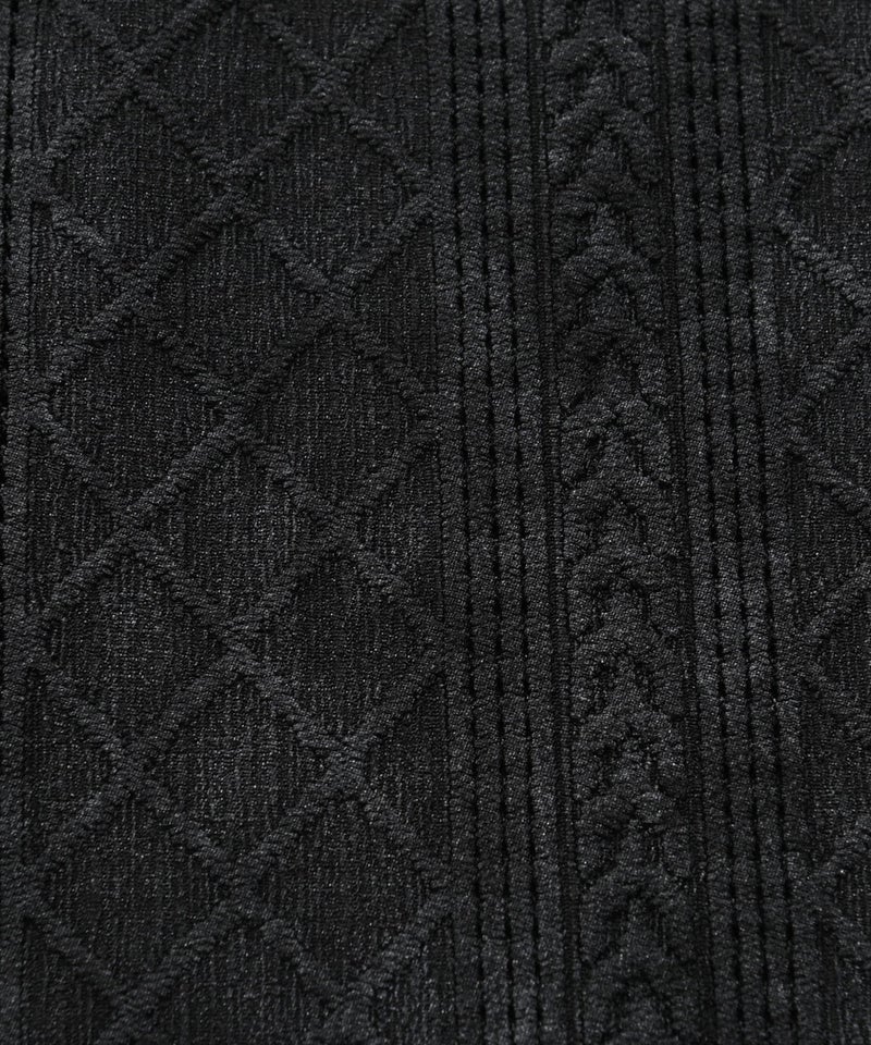 表面にはケーブル編みと格子柄を組み合わせた立体的なデザインを施し、シンプルながら存在感のある仕上がりに。