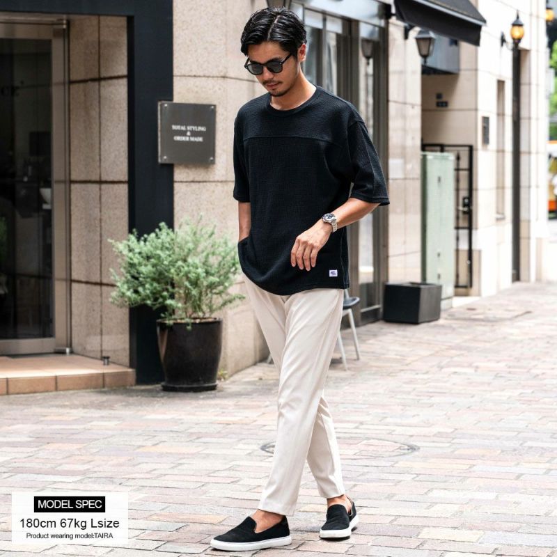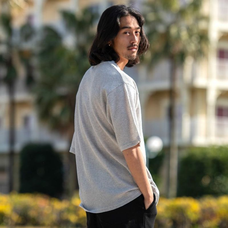 ニットのような凹凸感と柔らかな肌触りが特徴のワッフル素材を使用した5分袖Tシャツ。