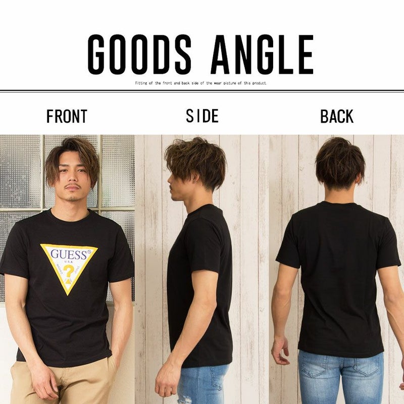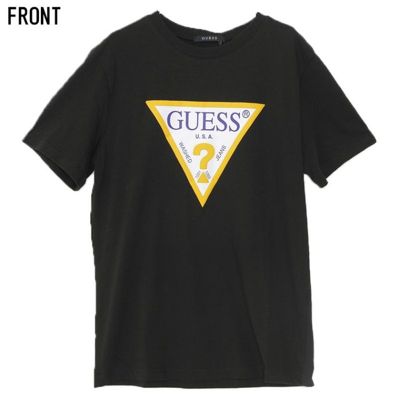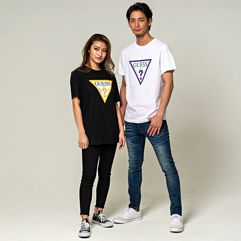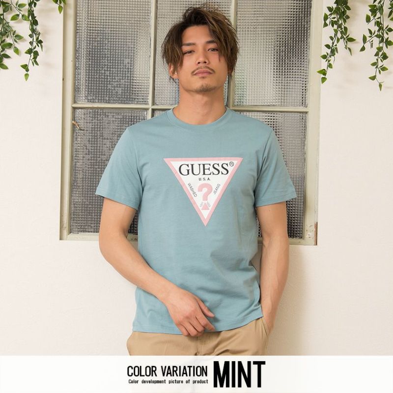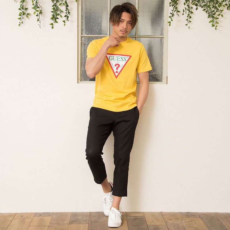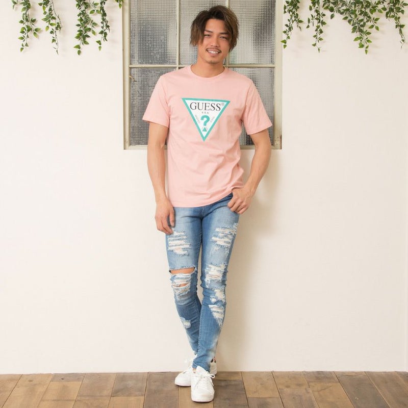 GUESSの定番デザインのトライアングルロゴのカラーリングを変え、いつもと少し違った雰囲気に仕上げたTシャツ。