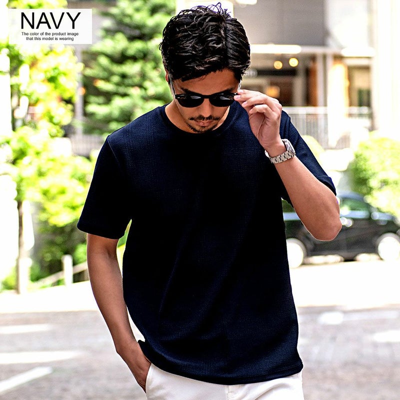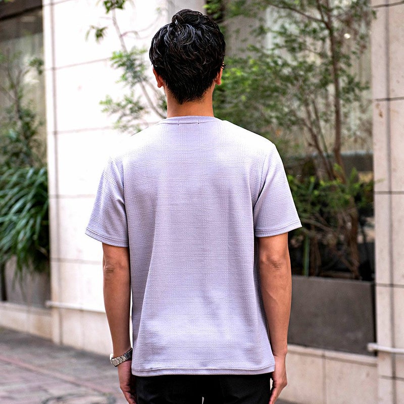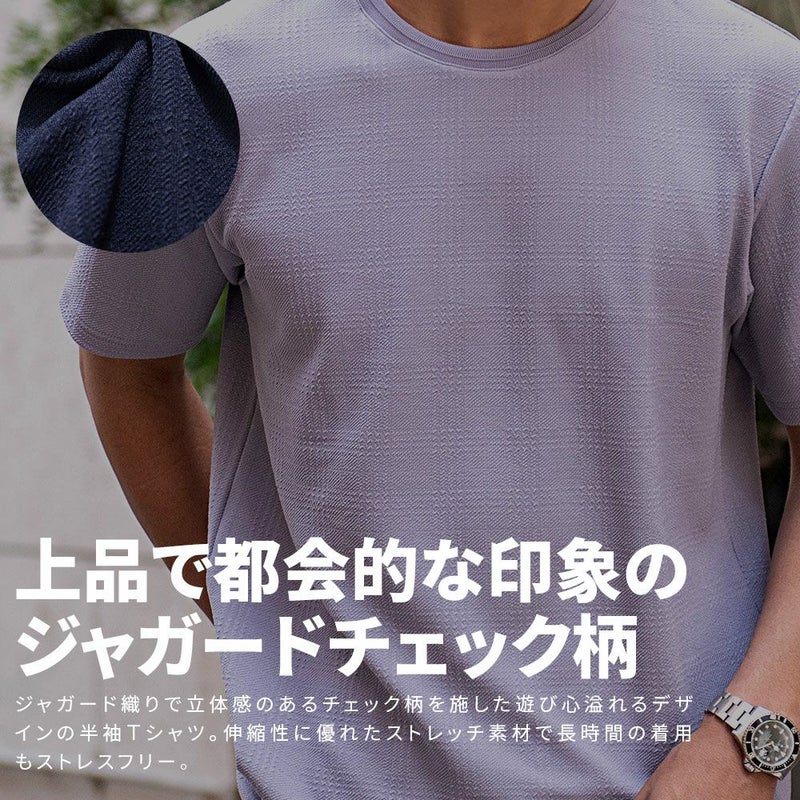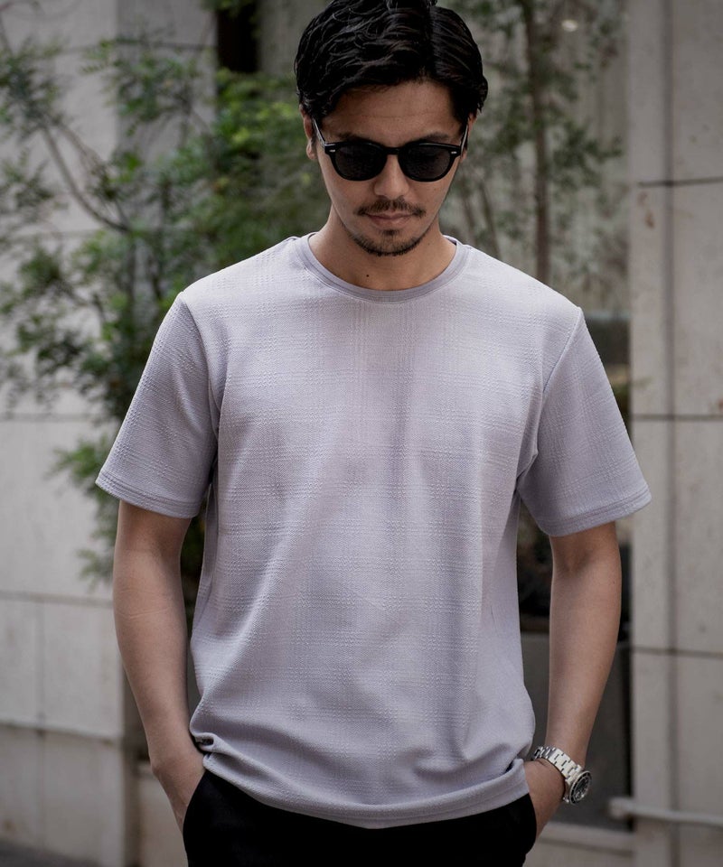 ジャガード織りで立体感のあるチェック柄を施した遊び心溢れるデザインの半袖Tシャツ。