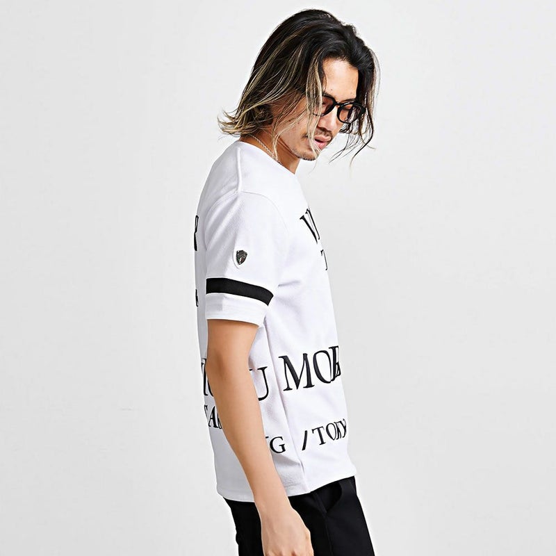 アートのように構成されたグラフィックワードがインパクト抜群の半袖Tシャツ。