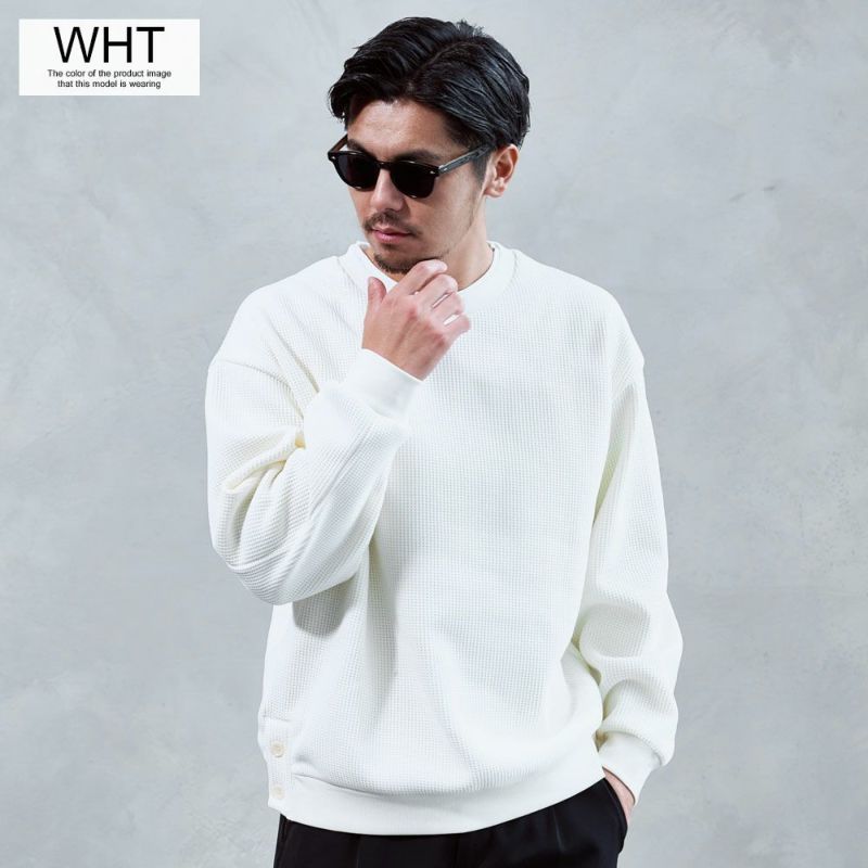 一見ベーシックなクルーネックトップスながら、裾のレイヤード風デザインとサイドボタンがさりげないアクセントとなり、1枚で着てもコーディネートが成立する存在感を備えています。