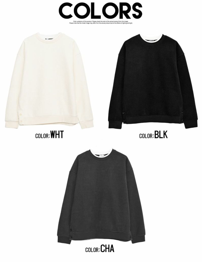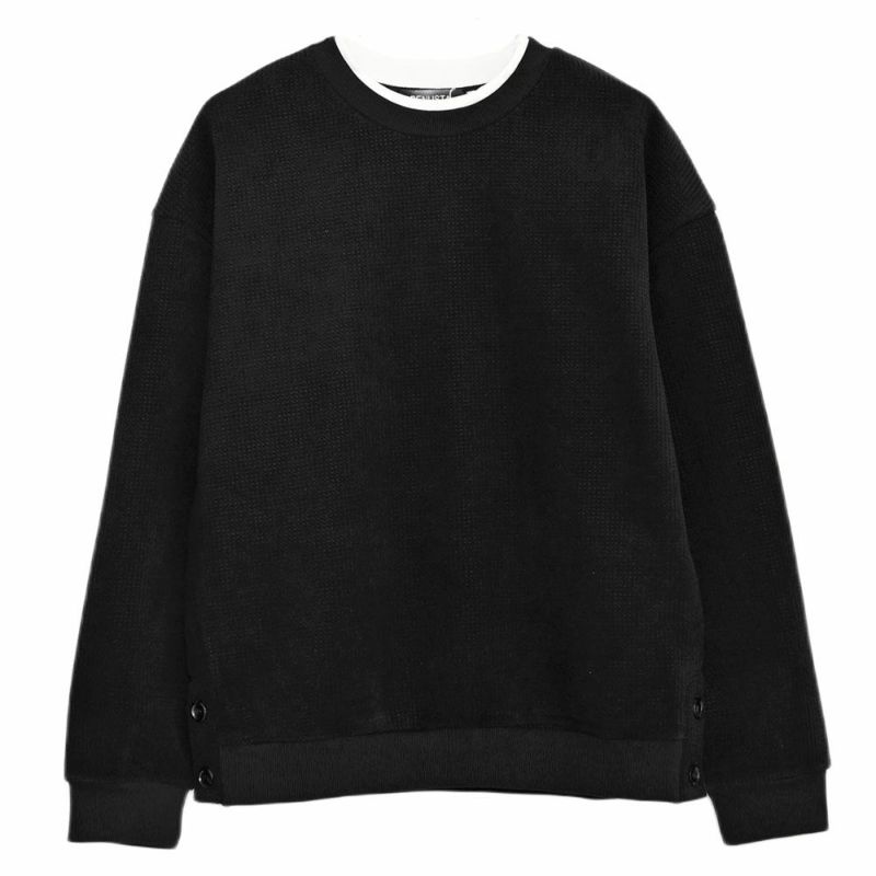 シンプルながらもひと工夫を効かせたデザインが魅力の、サイドボタンフェイクレイヤードトレーナー。