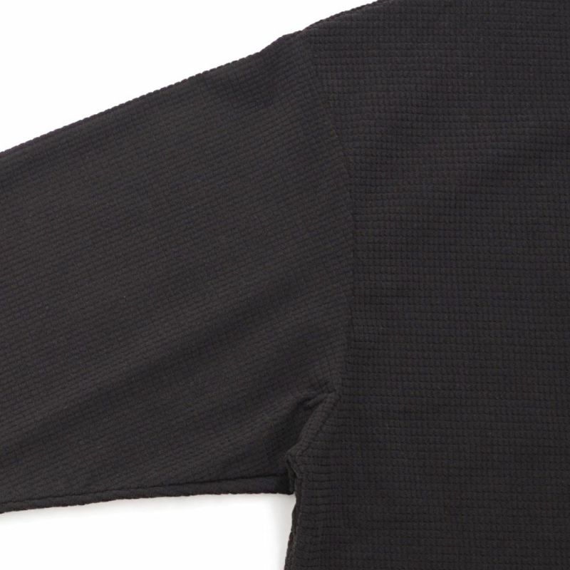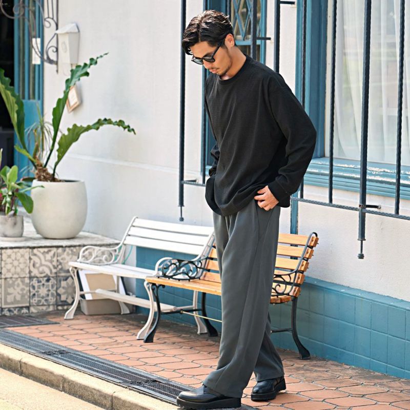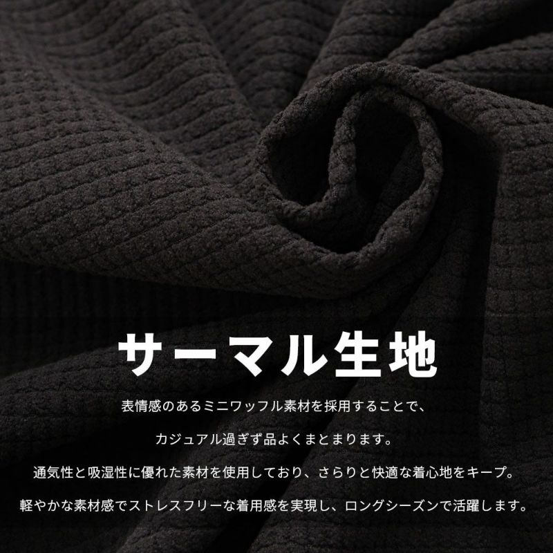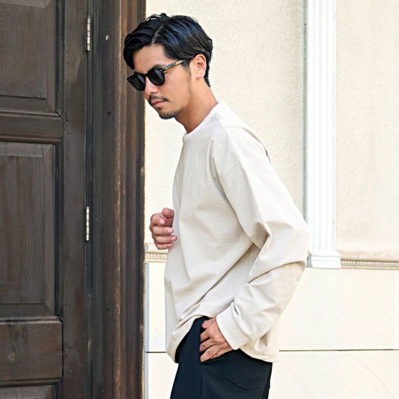 Tシャツ感覚で気軽に着られる肉感ながら、表情感のあるミニワッフル素材を採用することで、カジュアル過ぎず品よくまとまるのもポイントです。