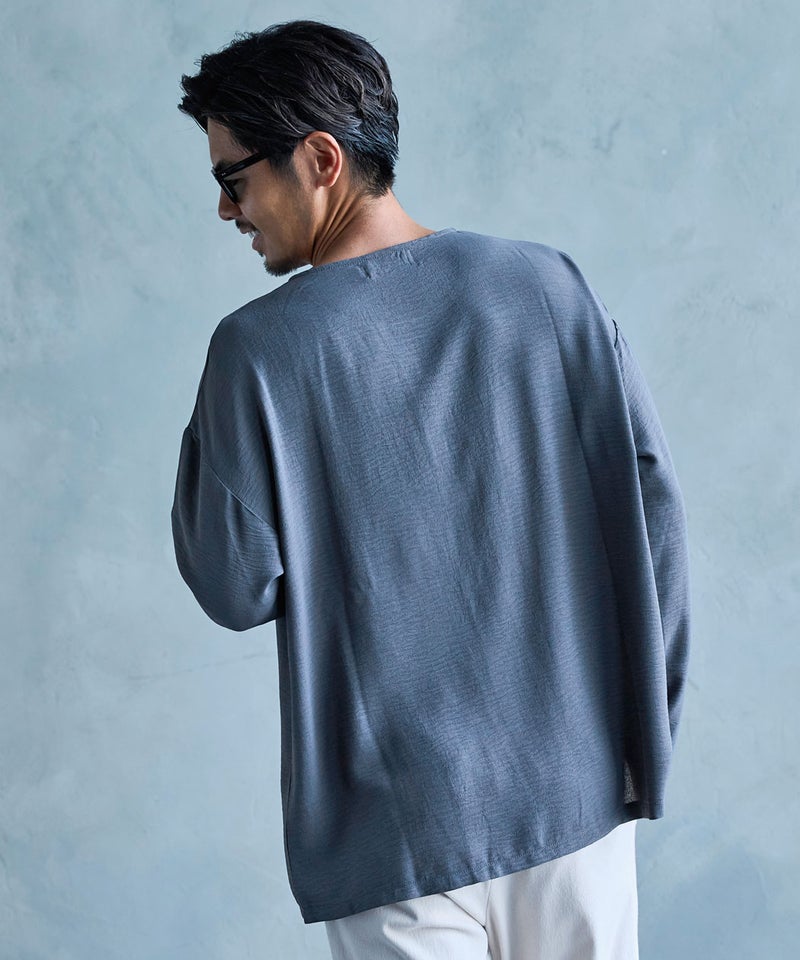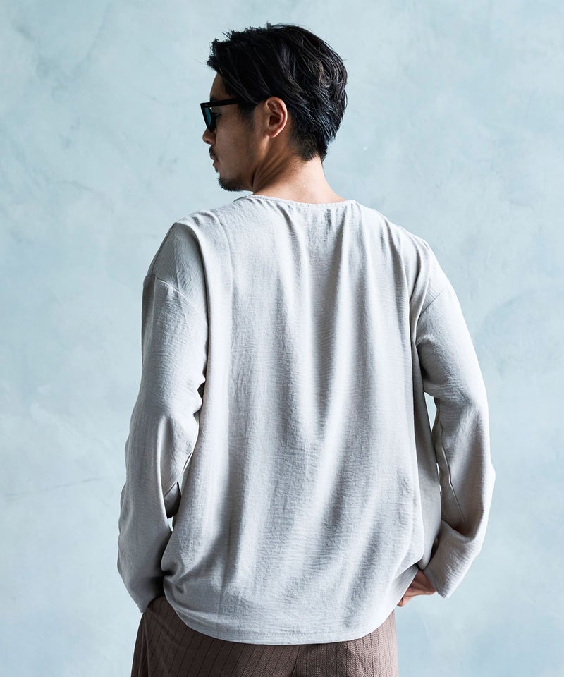 カットソーとはひと味違う表情を楽しめる、布帛素材のロングスリーブTシャツです。