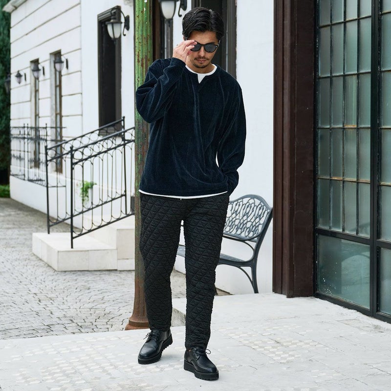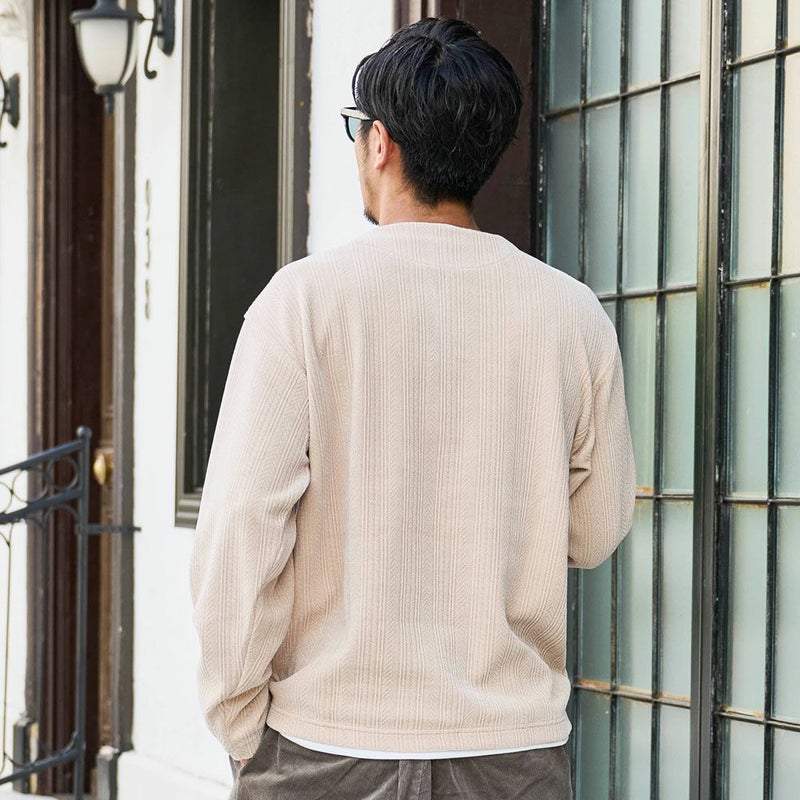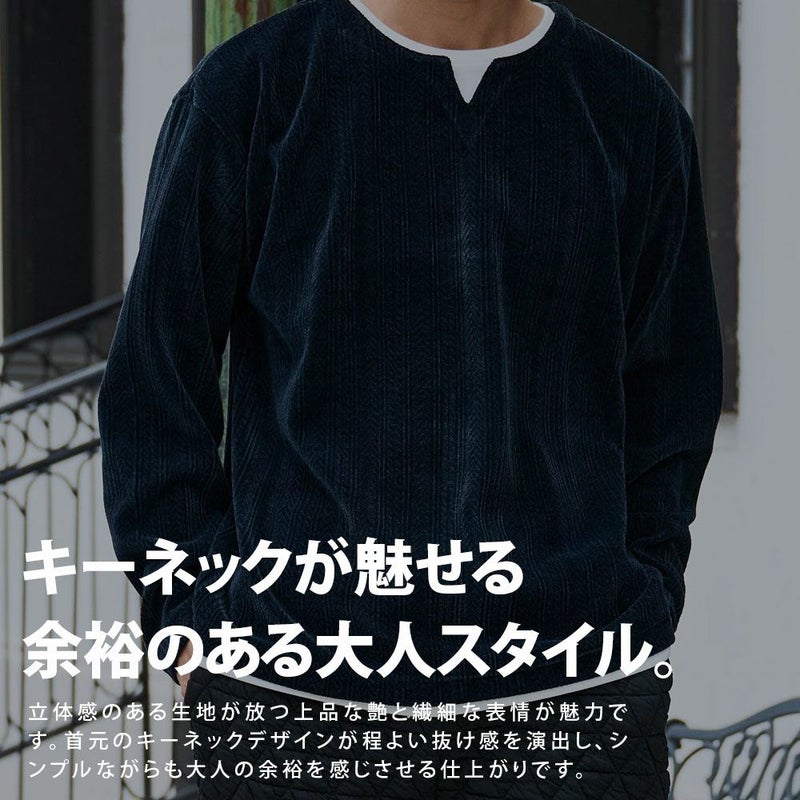 首元のキーネックデザインが程よい抜け感を演出し、シンプルながらも大人の余裕を感じさせる仕上がりです。