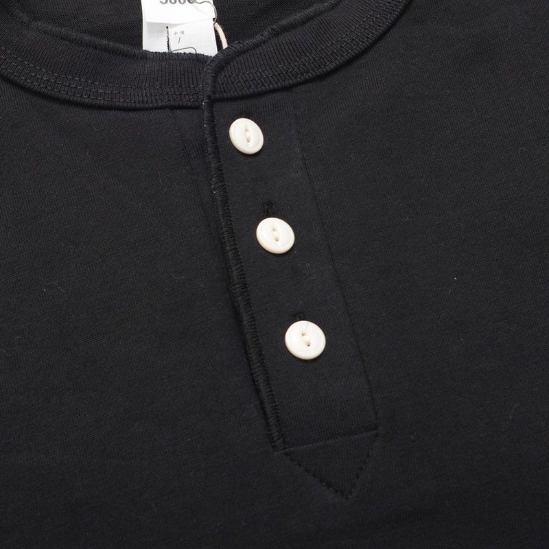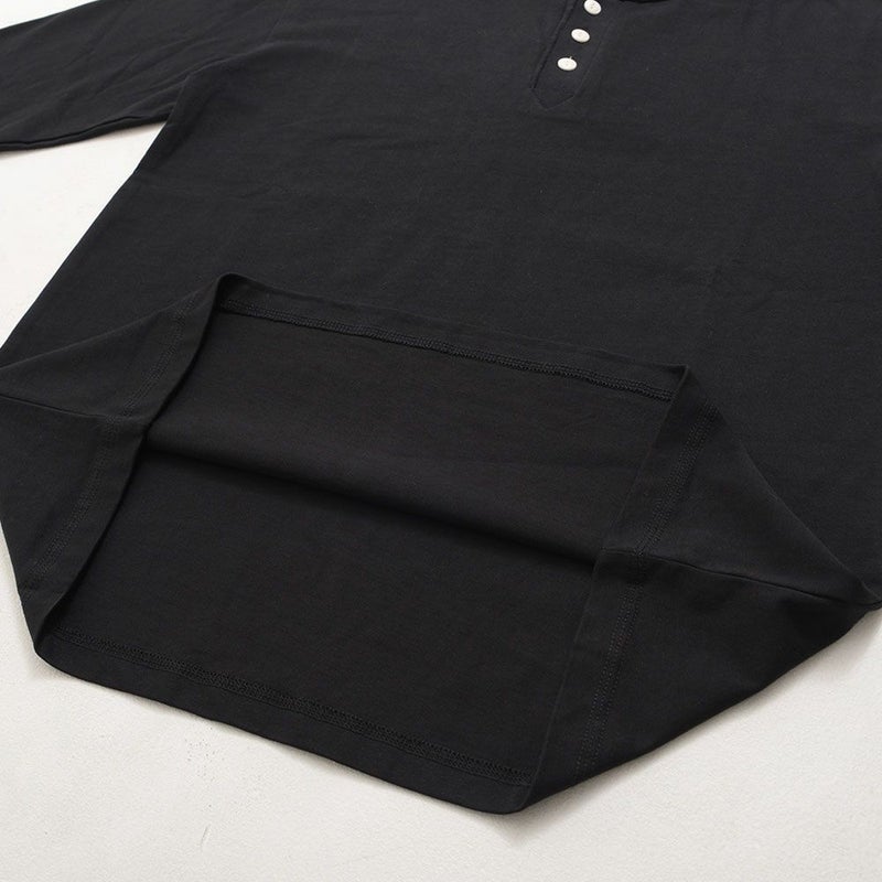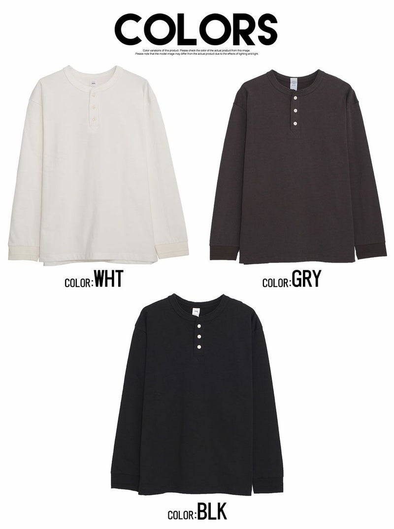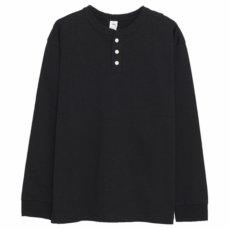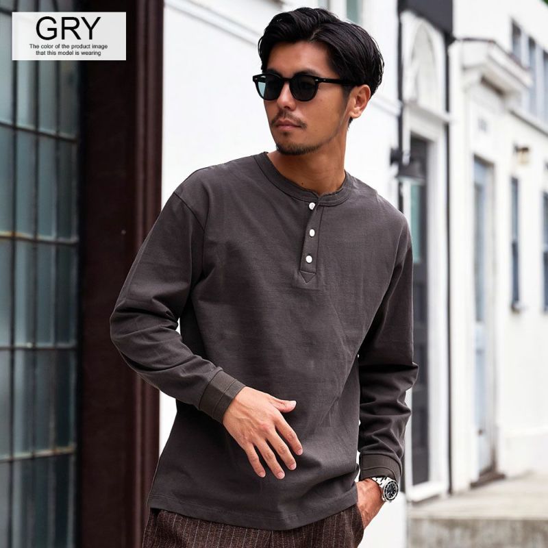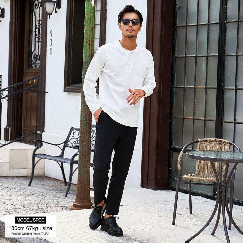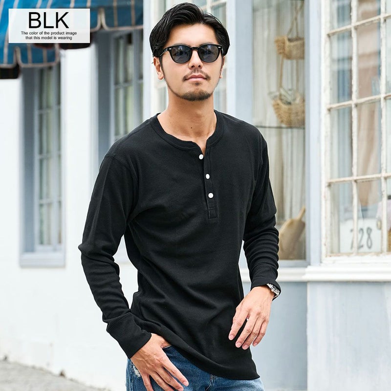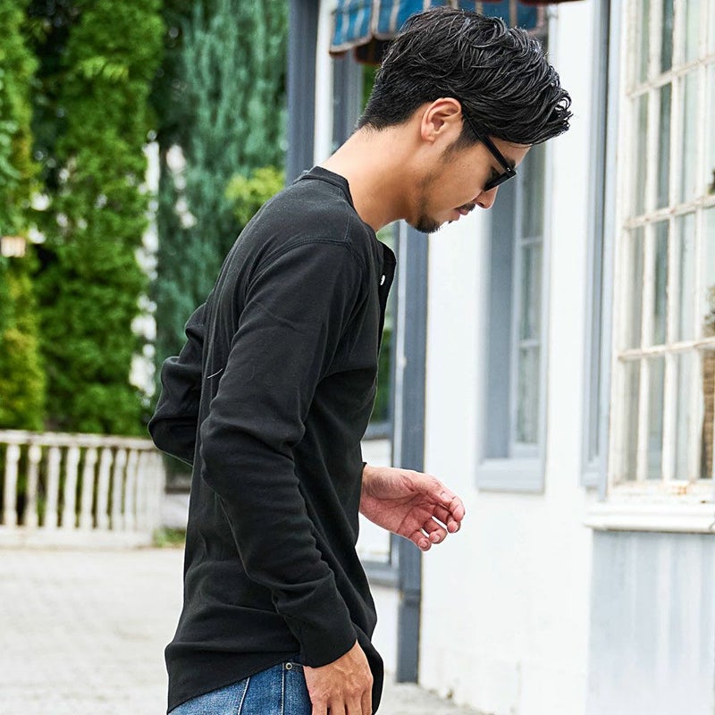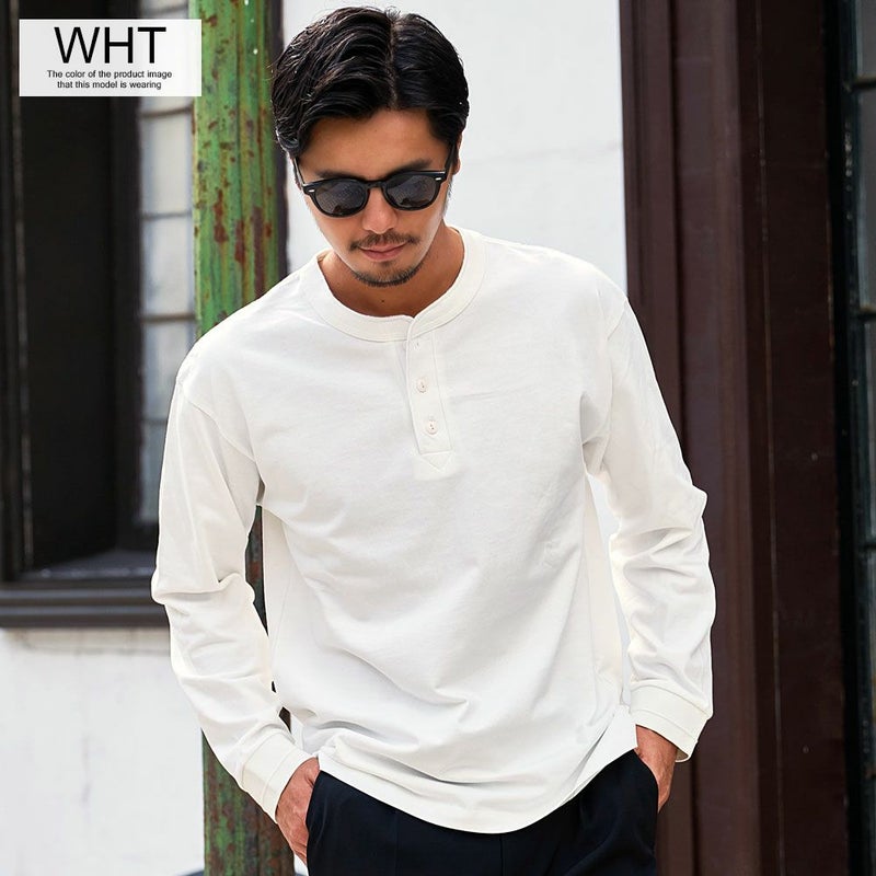 首元にさりげないアクセントを加えた、ヘンリーネックの長袖Tシャツ。