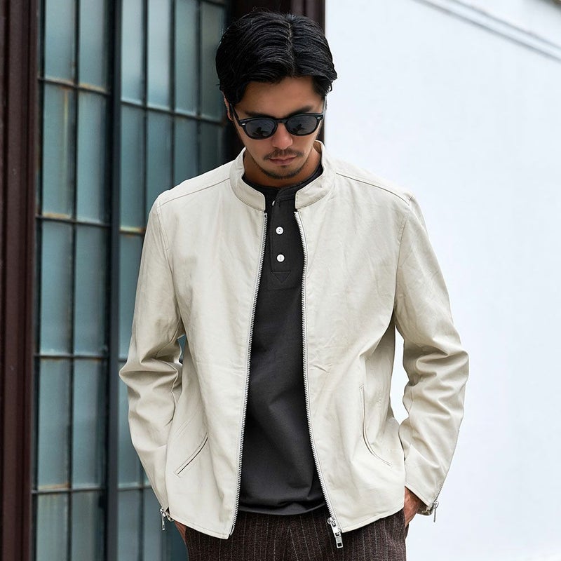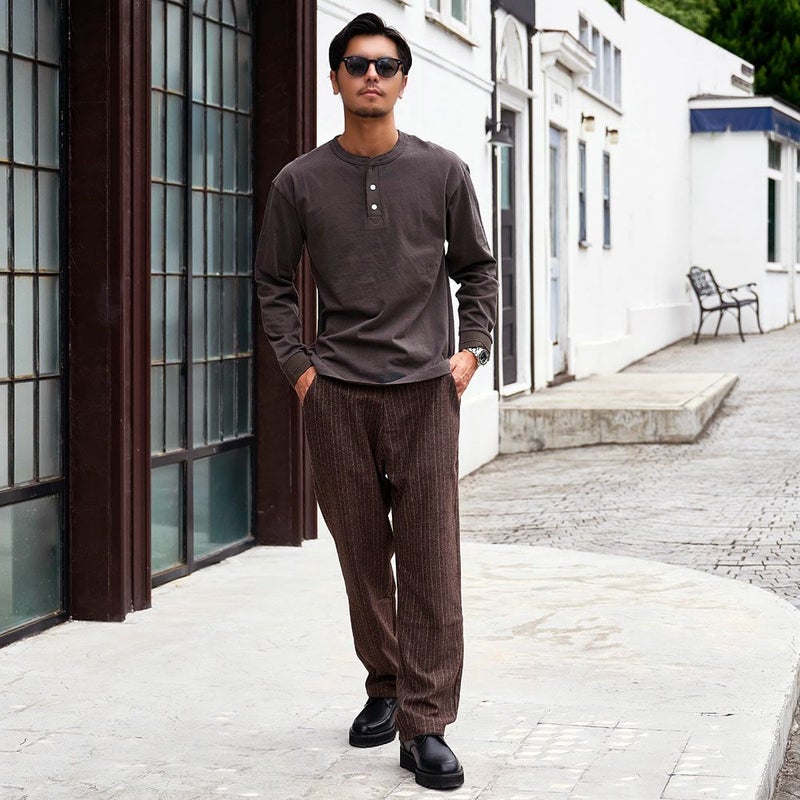ヘンリーネック特有の首元の開きが、顔まわりをすっきりと見せ、大人のこなれた印象を演出。