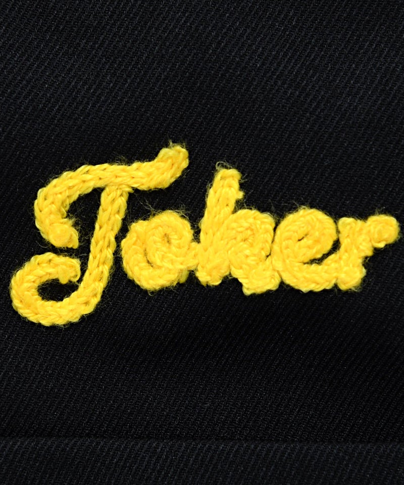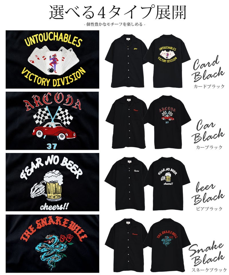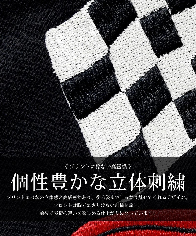 背面にはトランプやカー、ビール、スネークなど、個性豊かなモチーフを大胆に刺繍で表現。