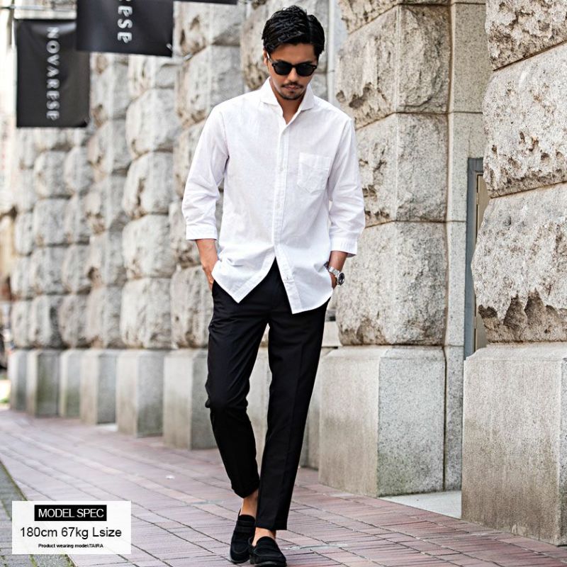 ホリゾンタルカラー(非常に開きが広い襟(衿)の形の事で、ワイドスプレッド・カラーと呼ばれる広めの襟よりもさらに開きが大きい)が特徴的です。