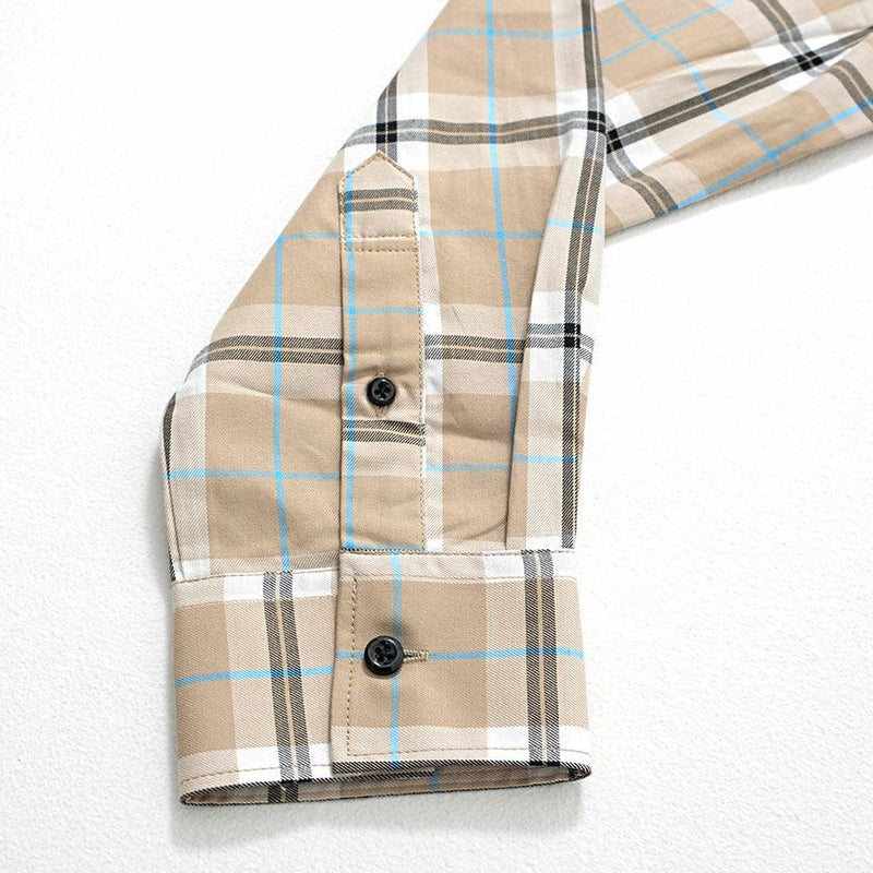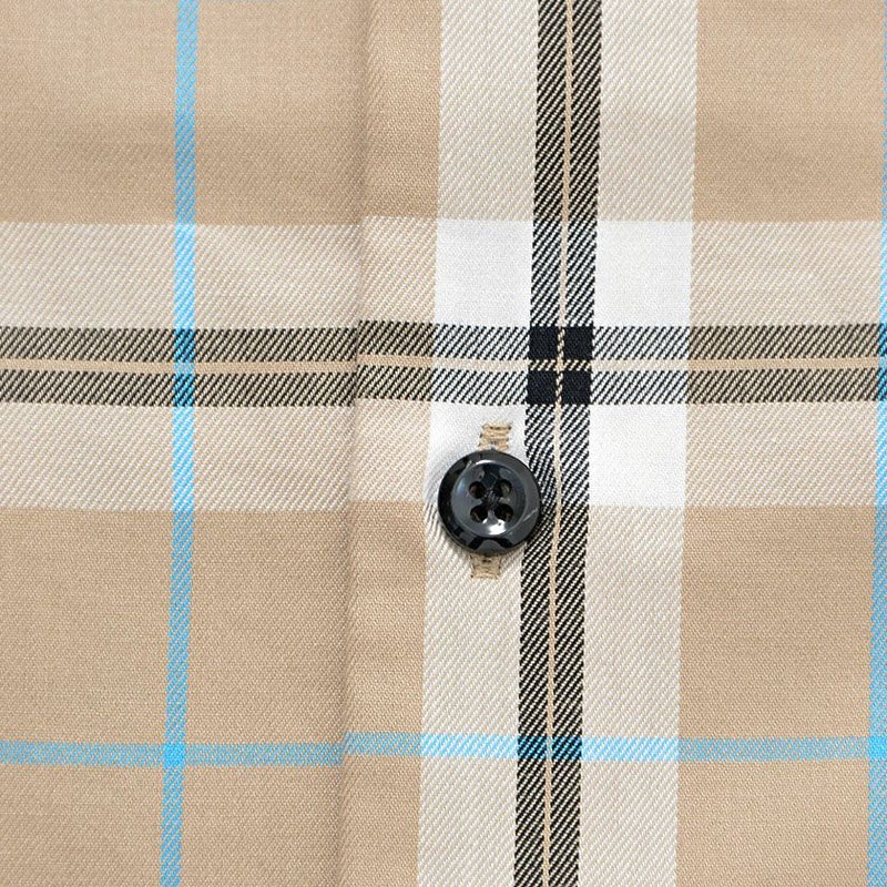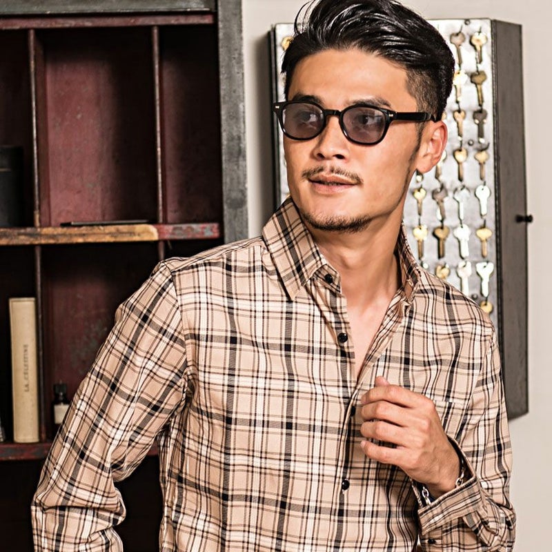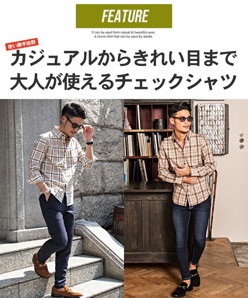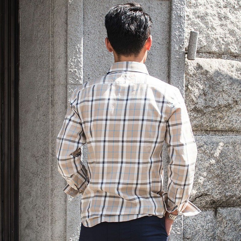 カジュアルになりがちなチェックシャツですが、落ち着いたベージュカラーをベースに