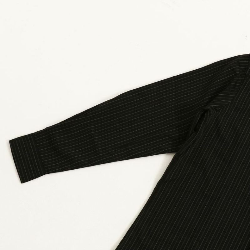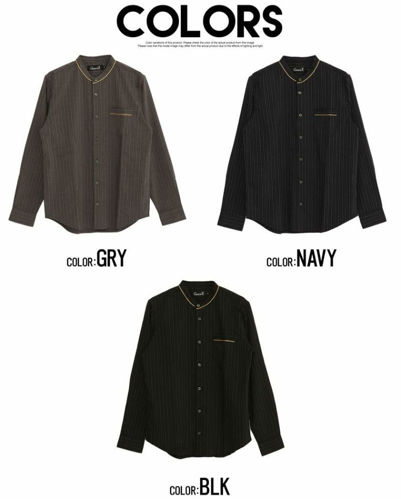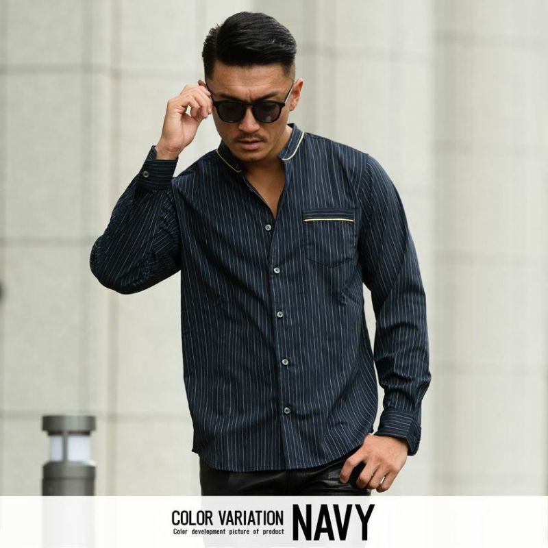 シンプルで清潔感のあるシャツ。ビジネスにもカジュアルにも使える万能アイテム。 CavariA(キャバリア)ゴールドパイピング入りバンドカラー長袖ストライプシャツ/全3色