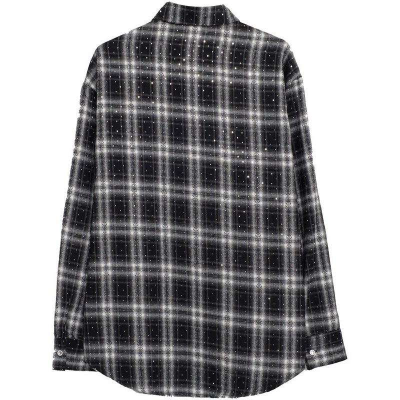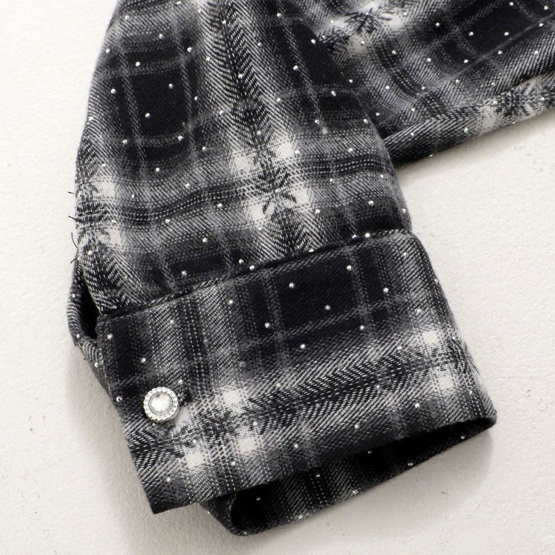 全面に散りばめられた繊細なストーン装飾が、動くたびに上品な輝きを放ち、1枚でコーディネートの主役になるデザインシャツ。